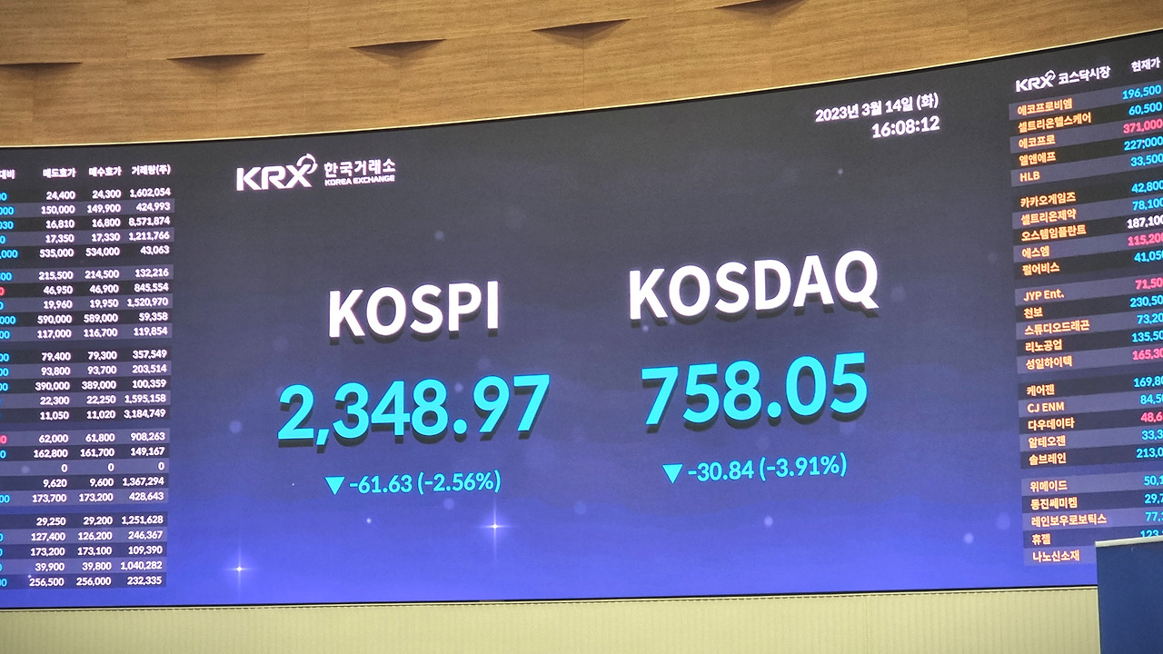 2023년 3월 14일 국내 증시 마감 상황 / 한국거래소에서 직접 촬영