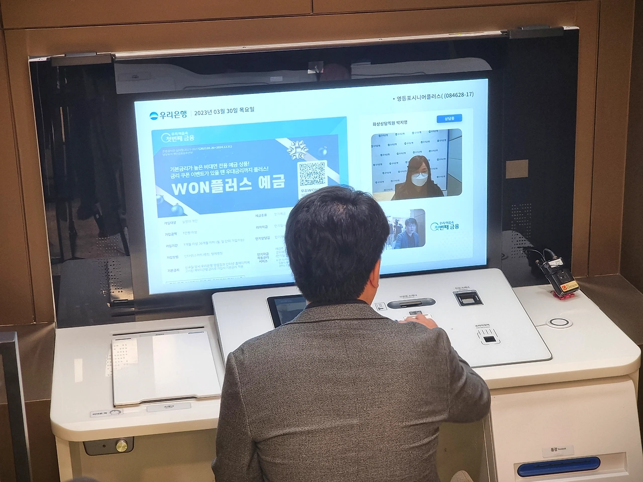우리은행 영등포시니어플러스점에서 화상 상담 창구를 시연하는 모습 / 직접 촬영