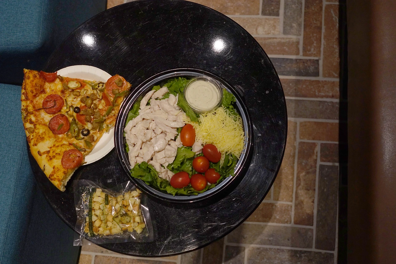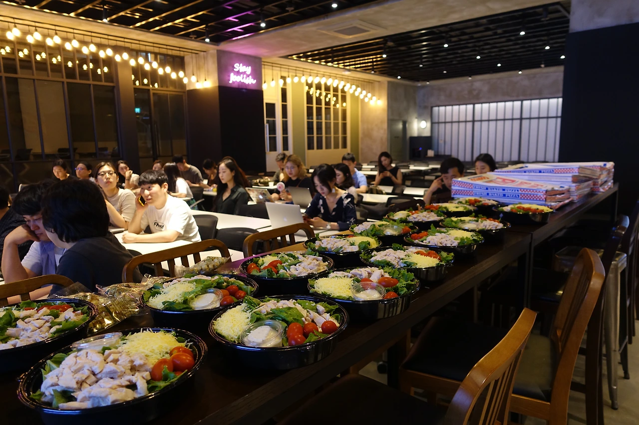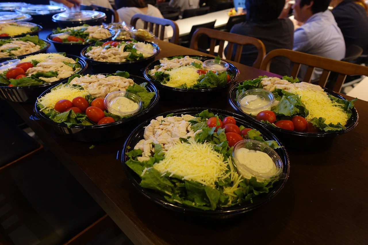 그리고 피자는 너무 심심할 거 같아 샐러드를 50개 주문했습니다. 1개에 3명이서 먹을 수 있는 양인데 너무 많이 남아 버렸습니다. 제가 샐러드를 선택한 이유는 피자만 먹으면 너무 느끼할 거 같아서였는데... 의외로 샐러드가 인기가 없었습니다. 한두 번 먹고 버린다던가... 토마토만 먹고 버린다던가..