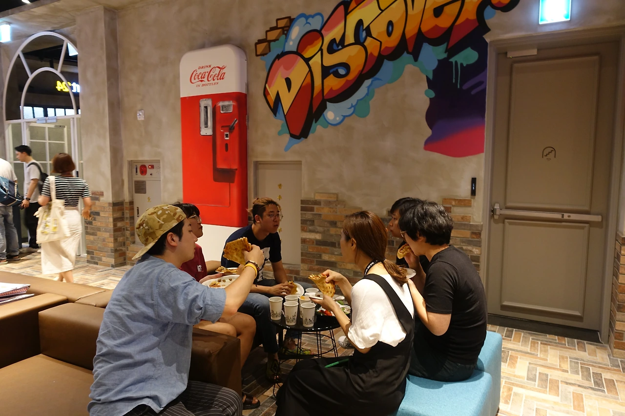 추측컨데 사진에서 등지고 피자를 만지고 있는 분은 저 피자 한판 다 먹었을듯합니다.