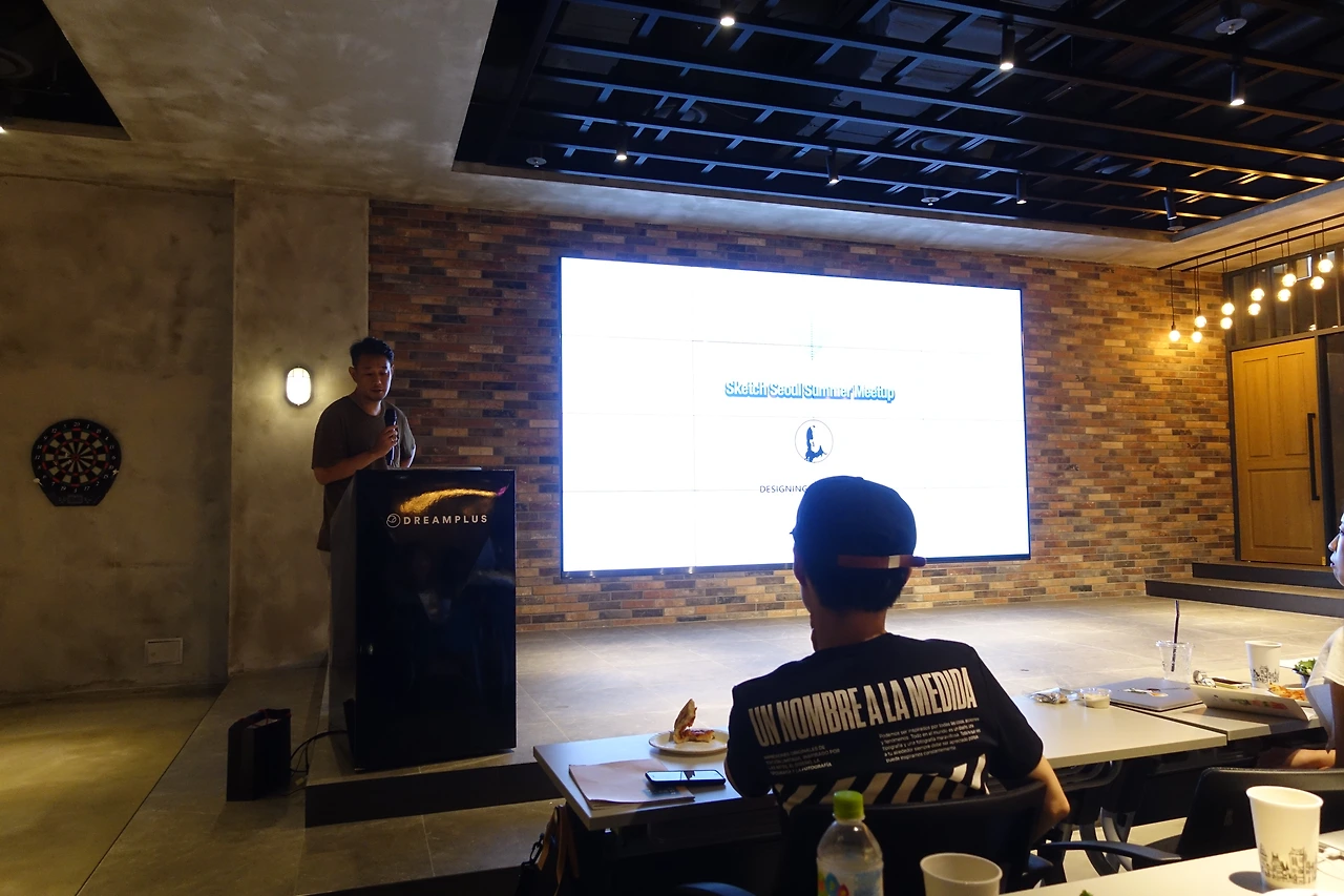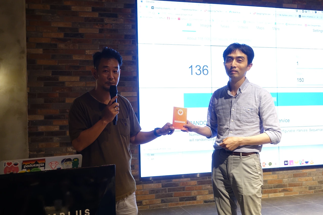 사진 왼쪽 뒤에 노란색 티셔츠 입은 사람은 킹서라는 디자이너인데 이때까지 제가 진행한 모임에서 경품을 한 번도 안 빠지고 다 탔습니다. 스케치 책, 스케치 라이선스.... 기타 굿즈.. 등 이번 행사 땐 과연 어땟을까요?