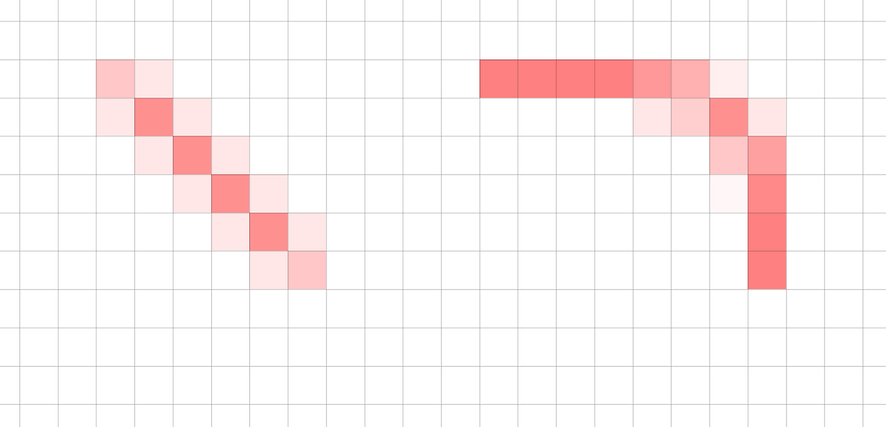 곡선이나 대각선 같은 경우엔 앤티얼라이징이 발생하기 때문에 어쩔수 없지만 최대한 픽셀 그리드에 맞게 그리는것을 추천합니다.