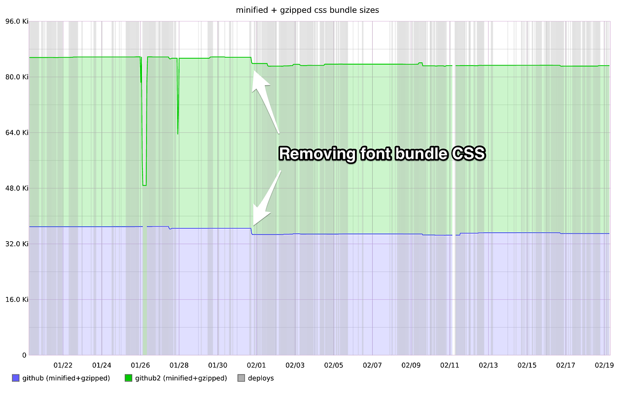 SVG로 전환할 때 페이지 로드 또는 퍼포먼스에는 별다른 부정적인 영향이 없었습니다. 우리는 렌더링 시간을 좀 더 극적으로 줄이기 위해 기대했지만 퍼포먼스라는 건 지각(perception)과 관련이 있는 거 같습니다. 페이지에서 SVG 아이콘은 높이/폭을 정의해서 기존 이미지처럼 렌더링 되기 때문에 jank(모니터 프레임과 브라우저 렌더링 프레임이 안 맞아서 생기는 증상)가 거의 없습니다. 뿐만 아니라 CSS를 이용해서 글꼴을 제공하지 않기 때문에 CSS 번들에서 CSS 폰트 코드를 없앨 수 있었습니다.