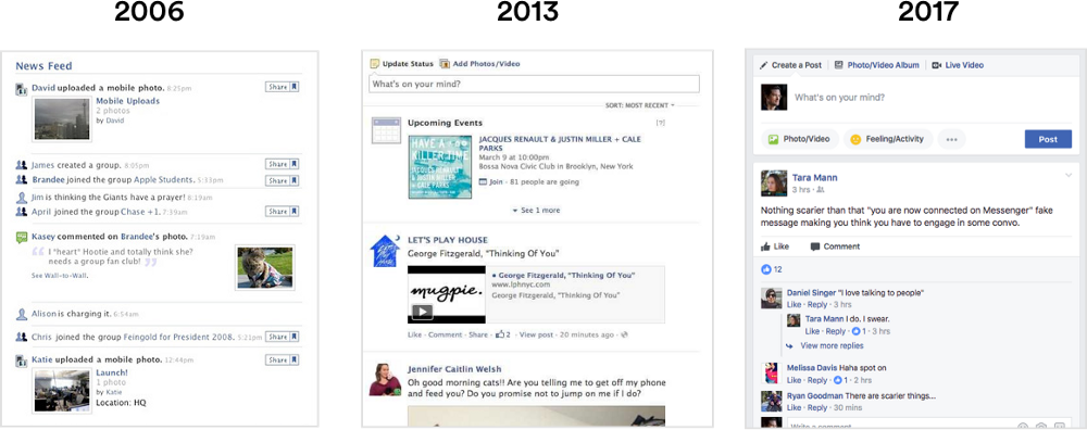 시대를 초월한 디자인이라.. 만약 페이스북 콘텐츠가 시간이 지남에 따라 개선된다면 논 할 거리가 되지만 뉴스피드 디자인 자체는 근본적으로는 변하지 않습니다. 예전으로 돌아가서 마이스페이스(Myspace, 한때 페이스북 경쟁 SNS가 사용자 경험(결국 이거 때문에 망함)에 근거하여 광고를 최적화했을 때 페이스북은 연결되어있는 사람들의 핵심 문제에 초점을 맞춘 최소한의 디자인으로 사용자들이 반겨했습니다.