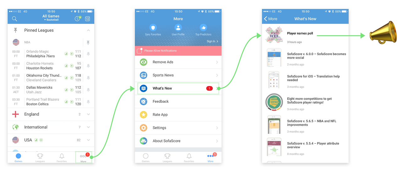 대신 사용자들한테 새로운 기능 생긴 경우엔 반드시 사용자들에게 알려주세요. SofaScores는 사용자들에게알림 아이콘을 이용하여 자체 앱에서 새로운 릴리즈 정보를 알려주고 있습니다.