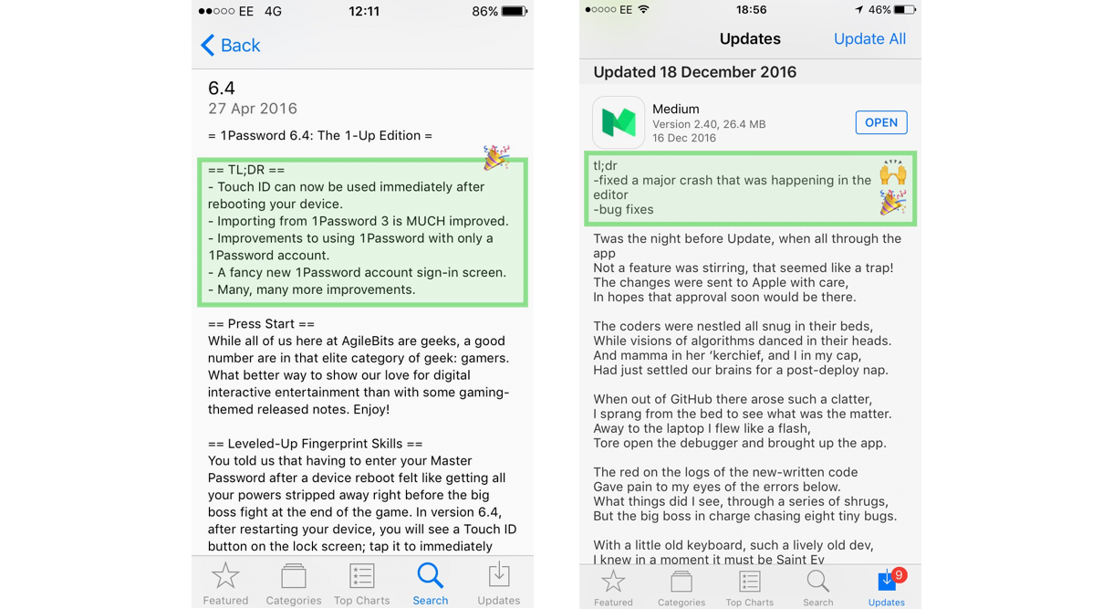 잘 포맷되고 잘 쓰여진 릴리스 노트는 2mm 차이의 훌륭한 예입니다. 앱을 '좋음'에서 '훌륭함'으로 도약하는데 차이중 하나라고 생각합니다.