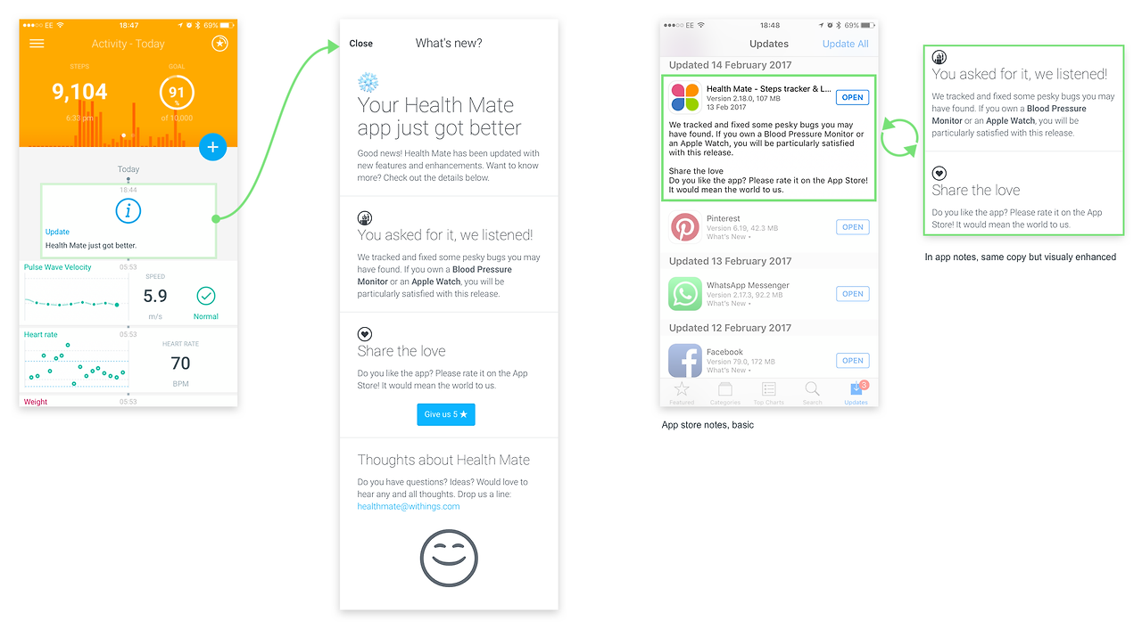 릴리즈 노트의 포맷을 정하기 위해 방금 들었던 모든 작업을 낭비해서는 안됩니다. 동일한 사본 및 레이아웃을 내부 전자 메일 또는 "새로운 기능" 앱에서 다시 사용할 수 있습니다. Withings는 App Store 혹은 앱에서 열람시 복사본을 동일하게 유지시켜줍니다.