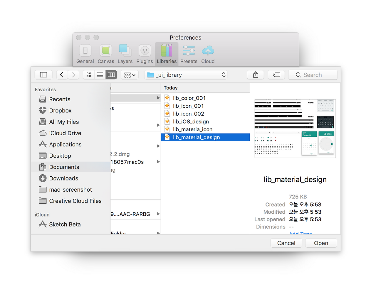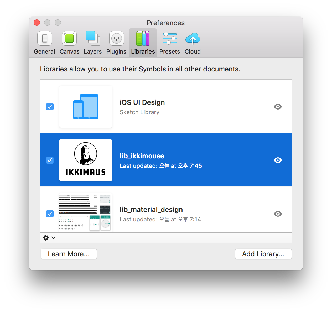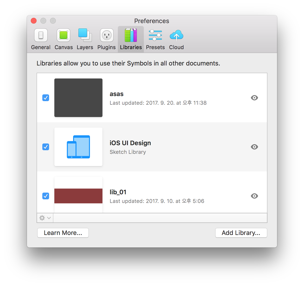 Sketch Beta > Preferences 메뉴에 Libraries 가 추가된 것을 알 수 있습니다.