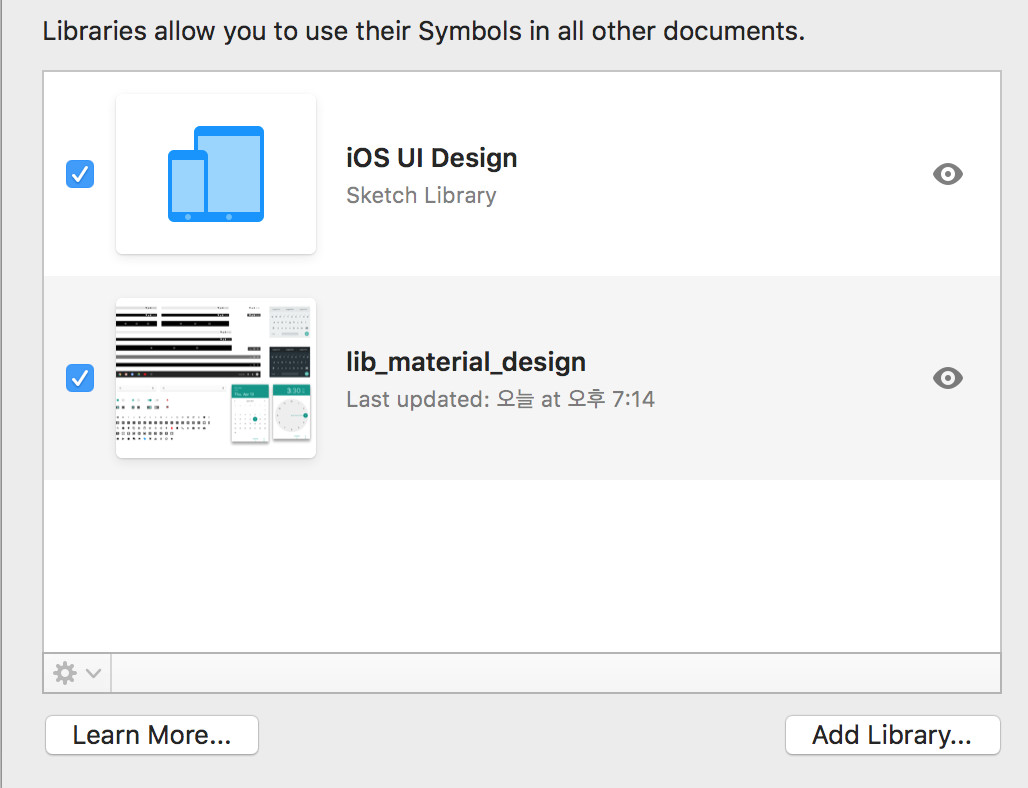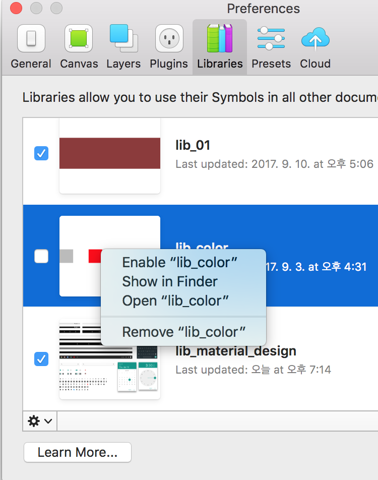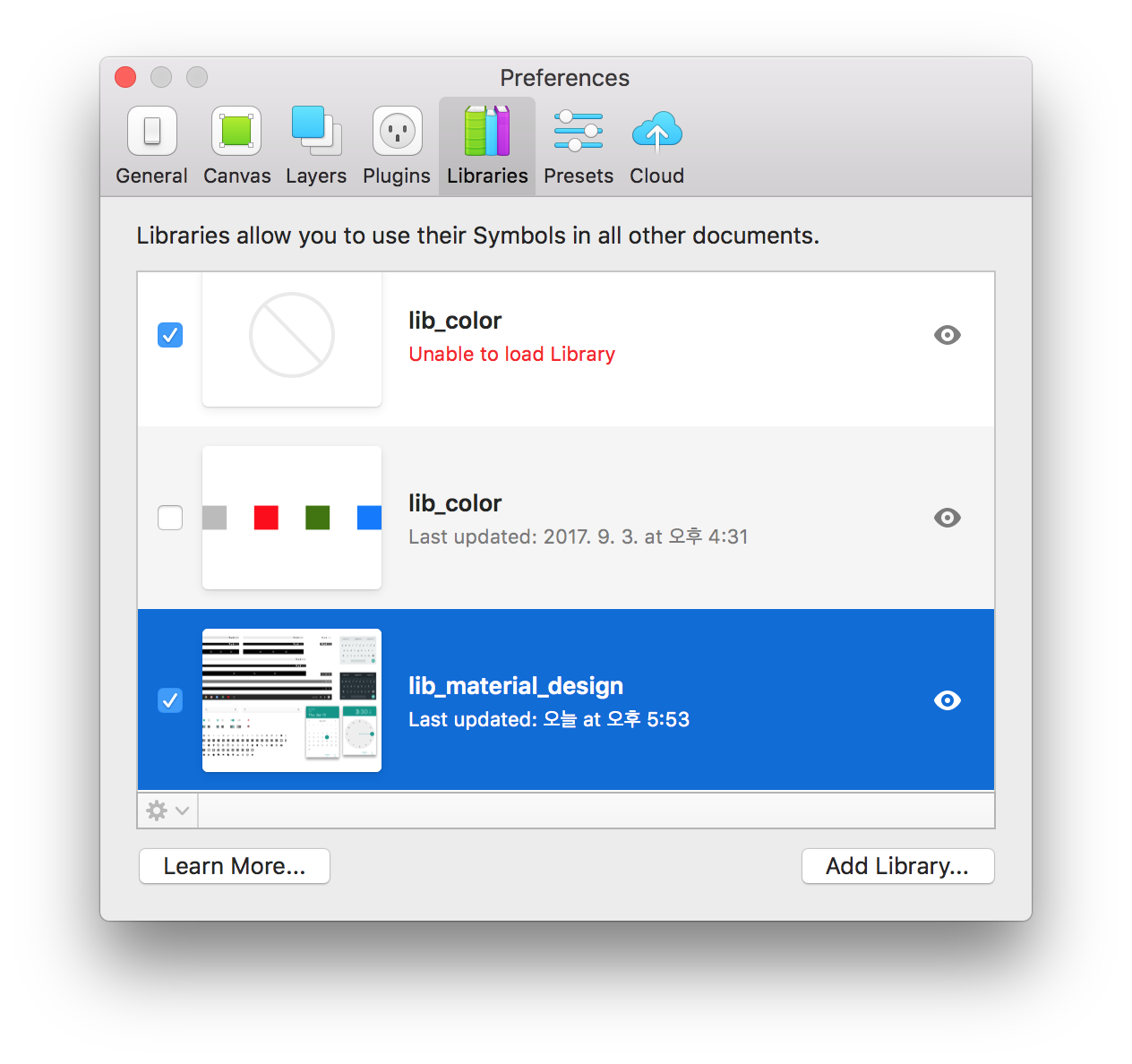 Sketch Beta > Preferences 메뉴에 Libraries 가 추가된 것을 알 수 있습니다.