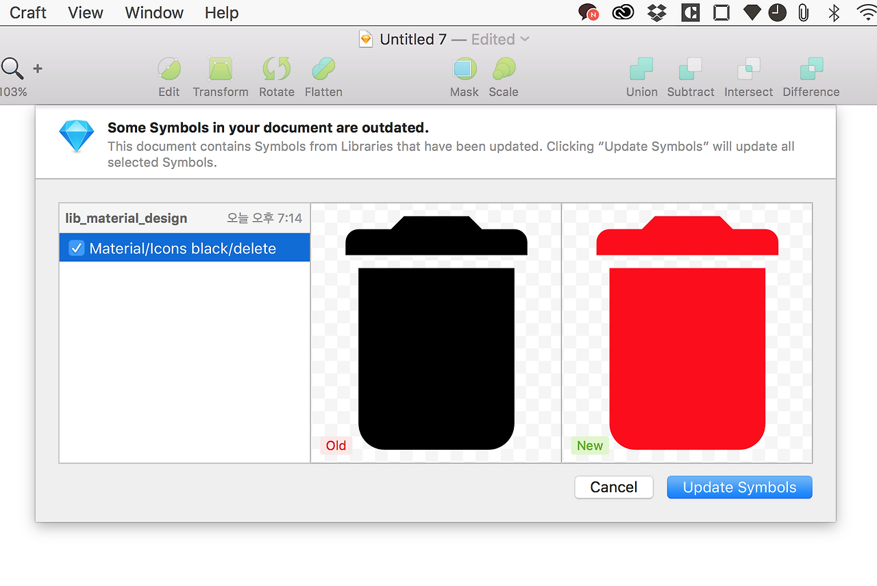만약 심볼 라이브러리의 심볼을 수정하면 해당 심볼 라이브러리 심볼을 사용하는 my_design.sketch 파일에서 수정 이력을 알려주는데 그건 우측 상단에 뜹니다. 단점이라 하면 알람 인터페이스 너무 작아서 인지하기 어렵다는 거네요.