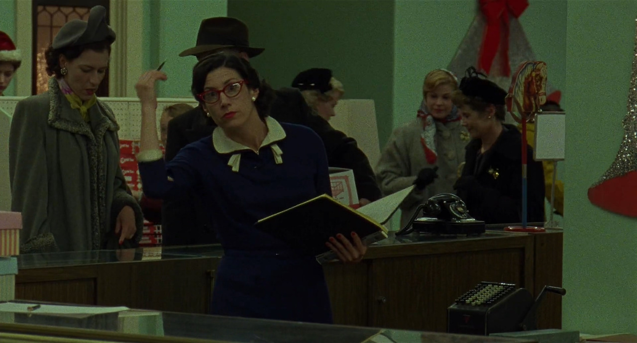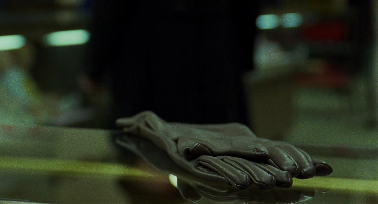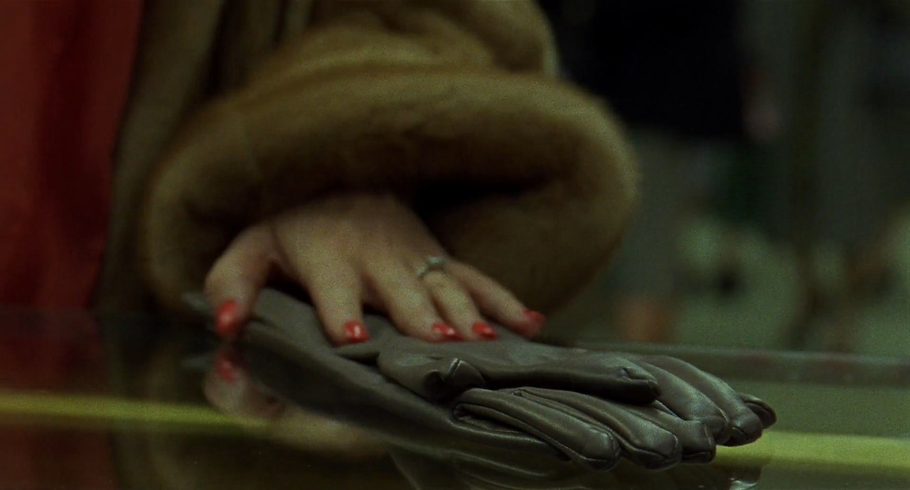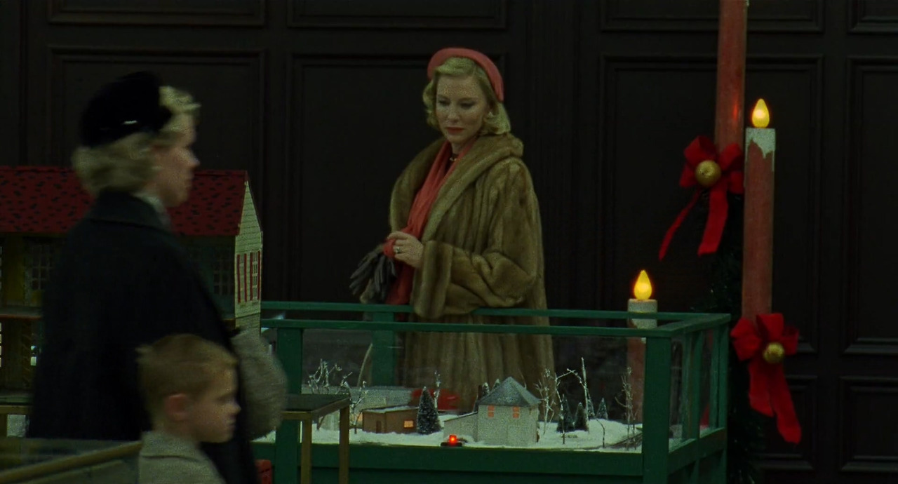 되짚어보면, 시간 순서상 가장 앞에 위치한 캐롤의 장면은 영화가 시작되고 약 10분여가 지나서이다. 영화는 딸의 크리스마스 선물을 사기 위해 백화점에 들른 캐롤을 테레즈의 시점에서 보여준다. 이때 캐롤은 장갑을 벗어서 어색하게 손에 들고 있다.