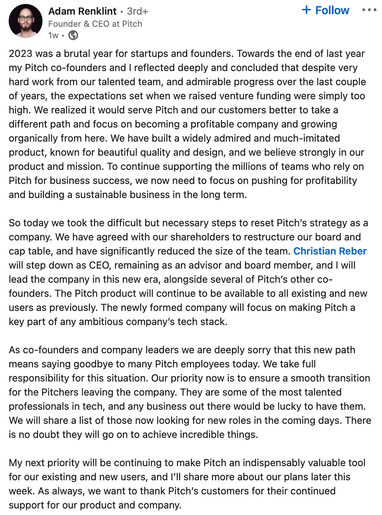 …the expectations set when we raised venture funding were simply too high. We realized it would serve Pitch and our customers better to take a different path and focus on becoming a profitable company and growing organically from here. We have built a widely admired and much-imitated product, known for beautiful quality and design, and we believe strongly in our product and mission. To continue supporting the millions of teams who rely on Pitch for business success, we now need to focus on pushing for profitability and building a sustainable business in the long term…(후략)