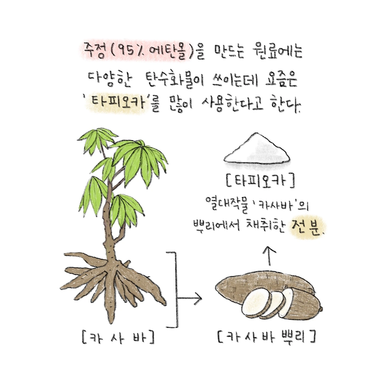 알코올이 되는 주재료가 열대식물 카사바의 뿌리에서 나온 타피오카라는 것도