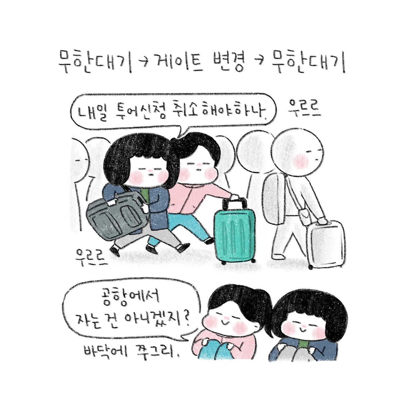 비행 스케줄은 계속 연기되었고, 게이트가 바뀌는 등
