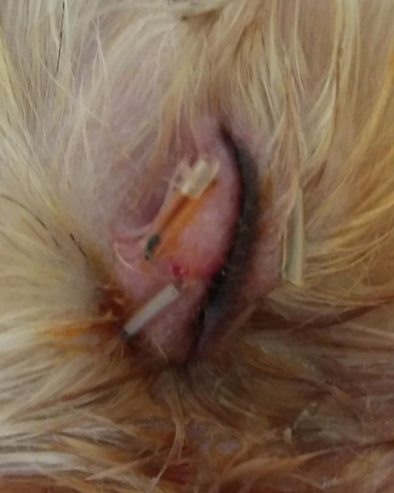 우선적으로 깨끗하게 창상을 만들었다. 그리고 하루 경과시키고 병변을 다시 살핀 후 이상이 없는 것을 확인하고, 혈관이 많은 제 3 안검을 끌어 댕겨서 구멍이 뚫린 각막을 덮어버렸다.