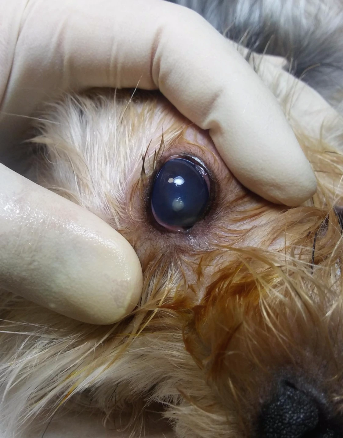 생각보다 상태가 좋지 않았다. 아예 각막에 구멍이 뻥~하고 뚫려 있었다. 그 사이로 고름 성상의 염증성 물질이 새어 나오고 있었고, 안구 내부인 전안방에도 관련 성상의 물질들이 두둥실 떠다니고 있었다.