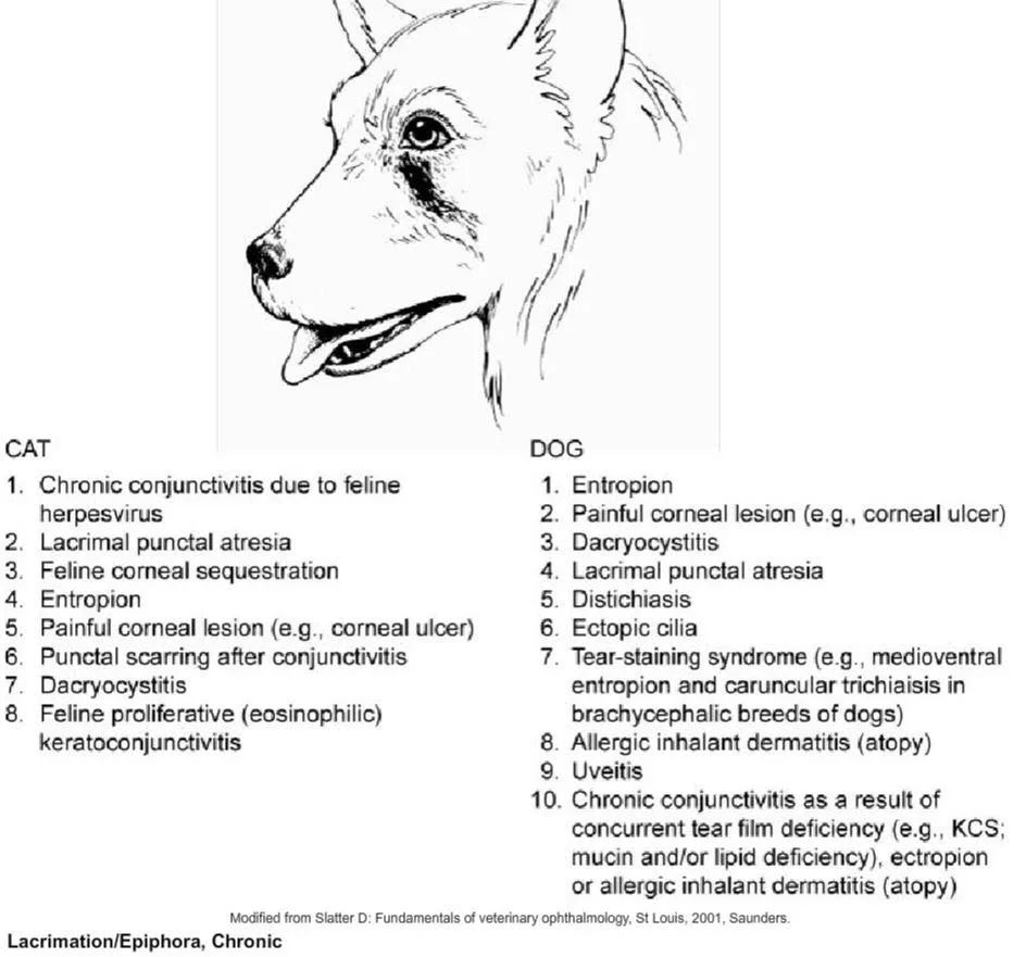 여담으로 동물병원에 가장 많이 오는 안과 질환은 유루증이다. 눈물자국으로 보통 불리는데, 원인은 아래의 사진과 같다. 아래의 그림은 수의내과학로 쓰이는 교과서의 본문 내용이다.