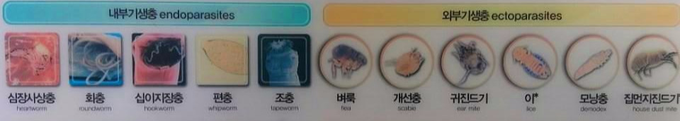 기생충 예방은 반려동물의 기본관리 중 예방접종 다음으로 중요한 것으로 월 1회 관리가 권장된다. 기생충은 소화기와 순환기(심장)에 감염되는 내부기생충(ENDO-PARASITES)과 외부기생충(ECTO-PARASITES)로 나뉜다.