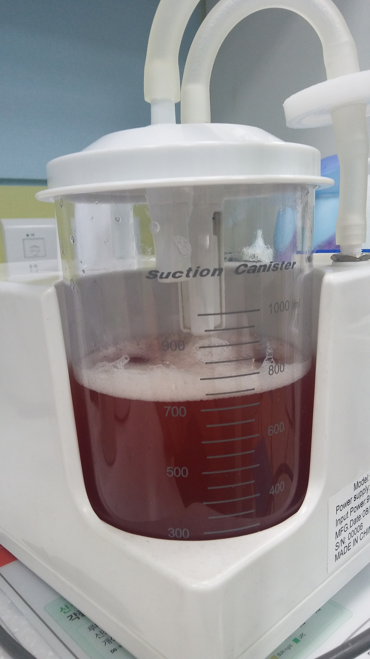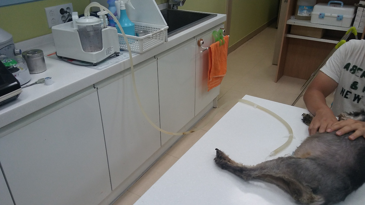 내원 목적을 보니, 안락사 상담이었다. 다시 근무복을 입고 진료실에 들어가니 낯익은 보호자 분께서 기운 없이 앉아계셨다. 진료실 책상에 축 늘어져 누워있는 12살 '류씨'는 급성 간경화로 여러 번 내원했던 노령 슈나우져였다. 이미 우리 병원에서 여러 번 복수를 제거했었다. 아래 그림처럼 한 번에 1L 가 넘는 복수를 제거하기도 했다. 또 내복약 복용을 근 한 달 했지만 회복 모습이 전혀 없었다.