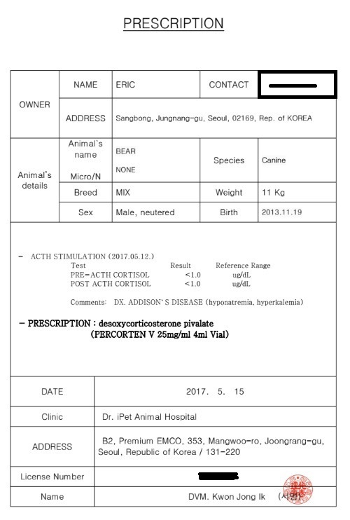 한 달 후 베어 보호자께서 오셨다. 후송보낸 병원에서 애디슨 확진을 받았고 한 달치 약도 처방받았다고 하셨다.