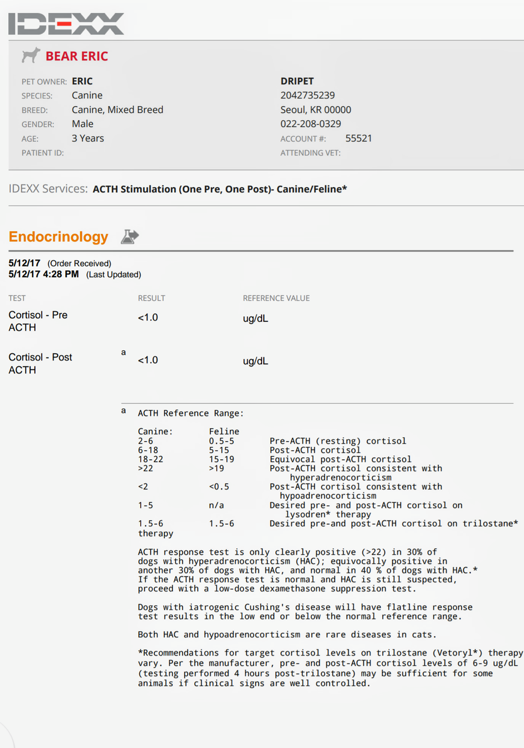 검사 결과는 변하지 않을 것이다고 재차 말씀드렸지만, 결국 우리 병원에서 코티솔 수치만 재검사를 진행하였다.