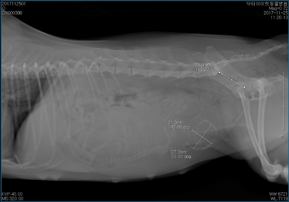 몇 마리가 배 속에 있는지, 크기는 어떤지 확인해보기로 했다. 엑스레이 촬영대에 올라간 꼬마는 불안해서 어쩔 줄을 몰라했다. 한번 꼭 안아주고 살포시 옆으로 몸을 뉘게 했다. 그리고 '철컹'하는 기계음과 함께 촬영을 마치었다. 수고한 꼬마를 보호자님께 먼저 건네드리고 다시 촬영실로 돌아가 모니터로 현상된 결과를 보았다.