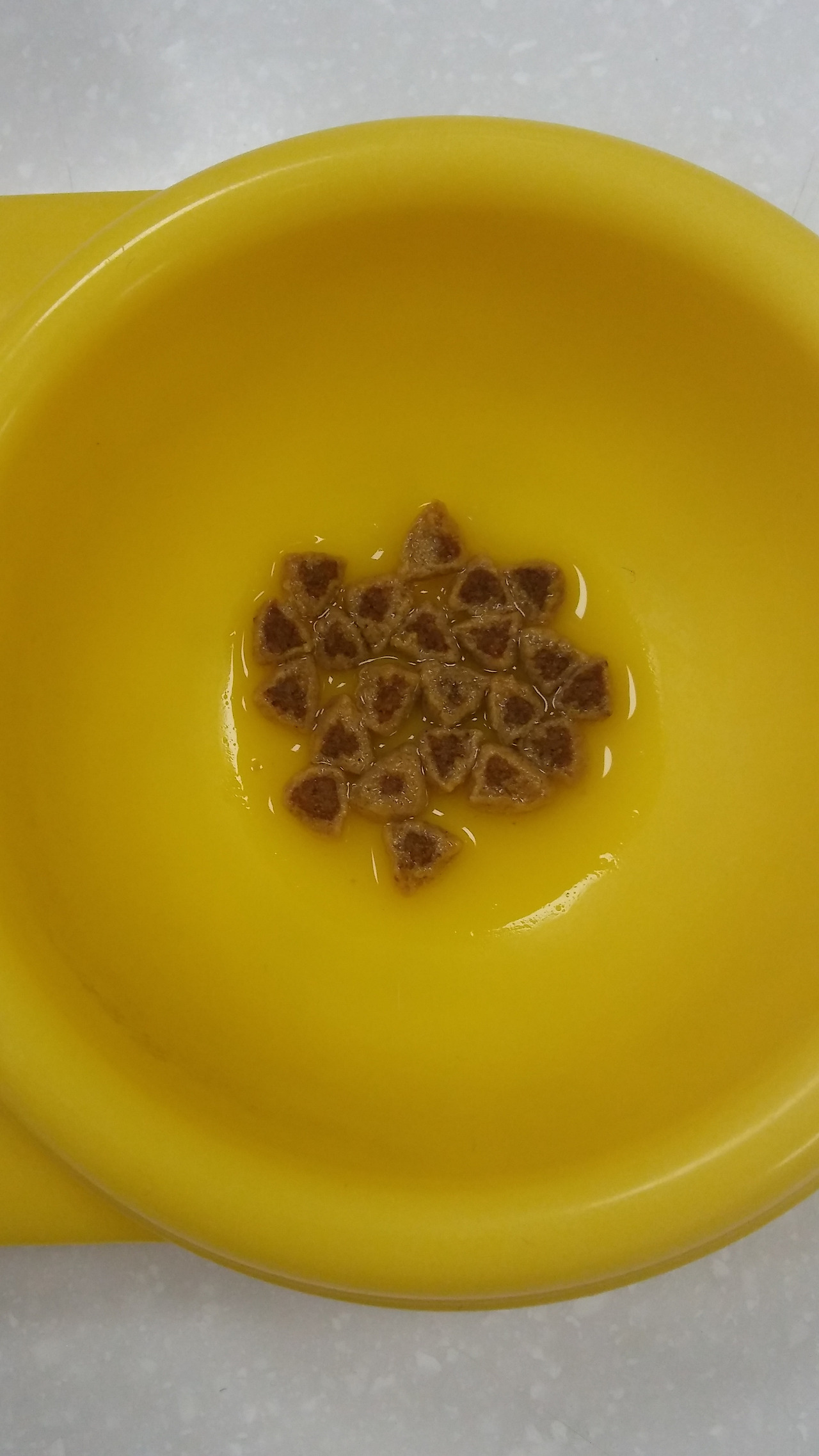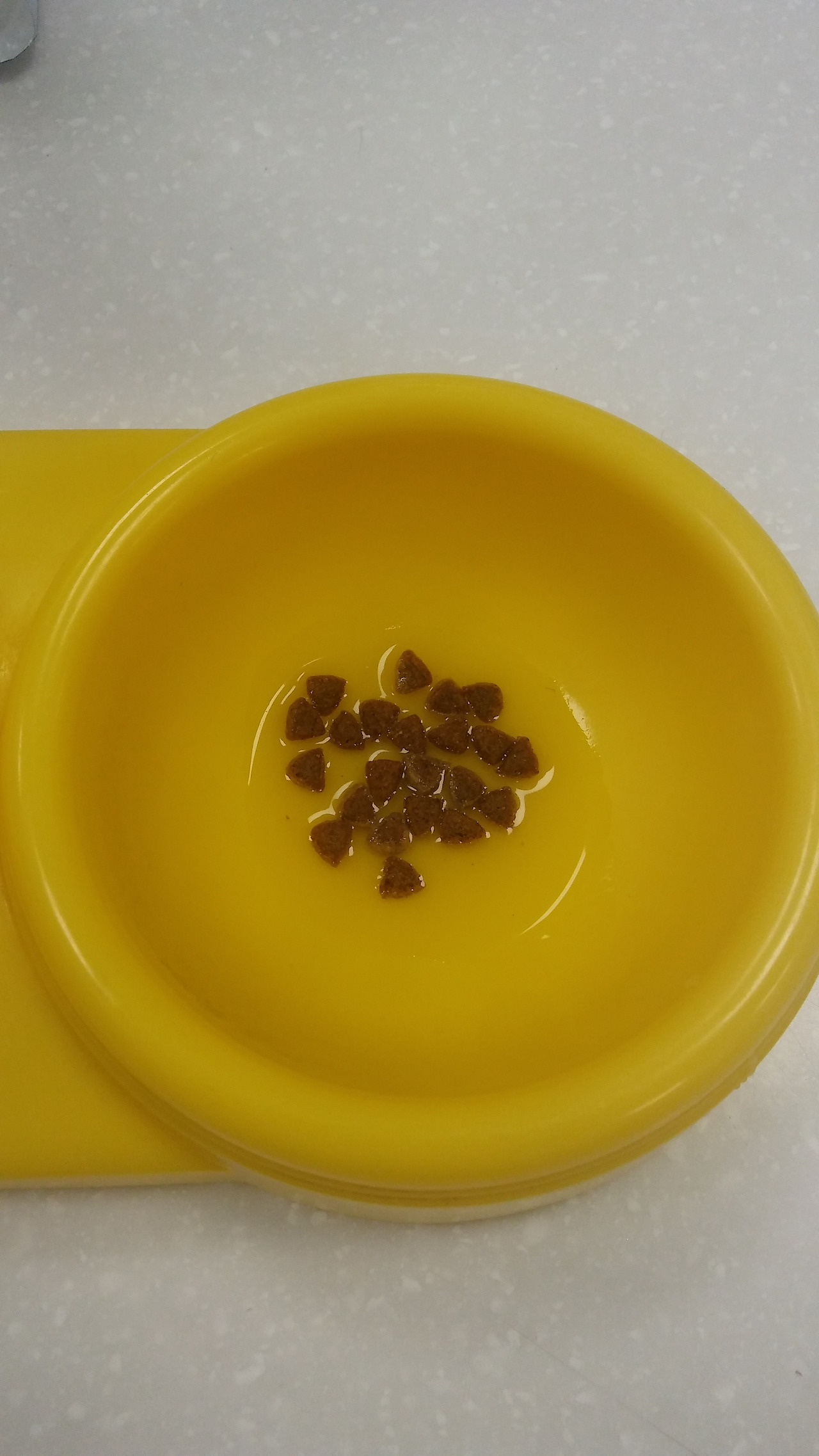 꼬마 아이들은 2~3주에 유치가 나기 시작한다. 이유기는 7주 정도로 이때부터 이유식을 본격적으로 한다. 3달 이전에 꼬마애기는 사진과 같이 자박하게 물에 불려주는 게 좋다. 사진처럼 적은 물로 오랜 시간 동안 불리는 게 포인트. 한 끼는 사진의 사료 양만큼 30알 내외로 하루 4번으로 시작해주고 변이 너무 단단하면 10프로 증량, 연해지면 다시 소폭 감량으로 해주면 된다.