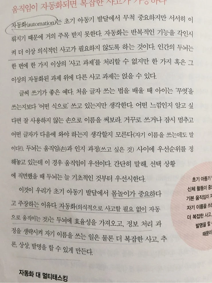하니베베카페 독서모임에서 읽은 <몸놀이가 아이 두뇌를 바꾼다> 에서도 이와 관련한 내용이 나와 있었다.저자 아동발달 전문가 질 코넬은 자동화 시스템을 설명한다. “자동화는 반복적인 기능을 각인시켜 더 이상 의식적인 사고가 필요하지 않도록 하는 것이다.” 몸놀이를 반복함으로 아이는 신체의 자동화 시스템을 갖추게 된다. 결과 뇌는 좀 더 복잡한 사고와 상상에 집중할 수 있게 된다. 이 책에선 운동 반복에 의한 결과를 이야기했지만 조절 훈련도 마찬가지 결과를 낳을 것으로 보인다.
