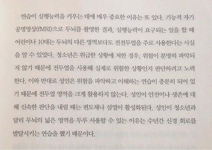 실행능력이 요구되는 일을 할 때, 어릴 때는 상위뇌 (전전두엽)를 쓴다. 상위뇌는 느리다. 체득하기까지 반복이 필요하다. 하지만 계속 사용하다 보면 그것이 점점 신경 회로로 강화된다. 결과 더 이상 상위뇌를 쓰지 않고 원시뇌(편도체) 반응만으로 신속한 판단과 실행이 가능해진다. 여기서 두뇌 반응 속도는 원시뇌>>상위뇌 이다. 원시뇌로 넘어간 실행 기능은 더욱 빠르고 능숙해진다.