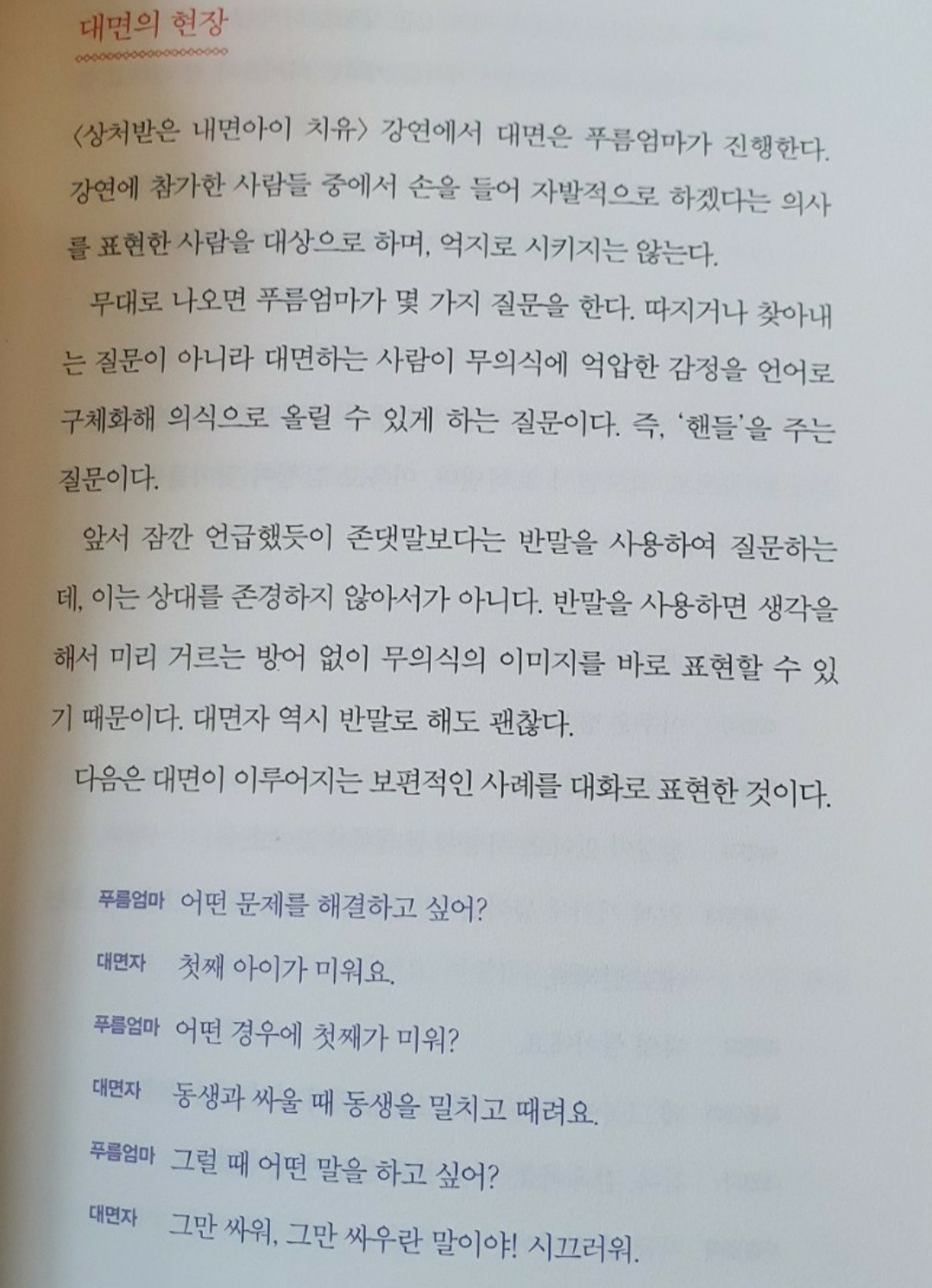 언젠가부터 자꾸 실망의 눈빛을 날리게 됐다. 정말 똑똑한데, 모르는 건 진짜 어떻게 설명해도 못 알아듣는다. 나도 이렇게 답답한데 너는 얼마나 답답하겠니. 알면서도 속상했다. 빛나는 아이를 온전히 보지 못하는 것 같아 마음이 아팠다. 그런 나를 바꾸고 싶었다. 그러던 중 푸름아빠 거울육아의 한 파트를 읽게 되었다. 내 행동은 나의 상처받은 내면아이와 연관이 있었다. <대면> 항목에 있는 대화를 내게 하는 질문이라 생각하고 대답해보았다.