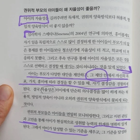 아이는 부모가 다양한 대안을 제안하고, 그 제안 안에서 자신의 목표, 가치 흥미에 따라 결정을 할 수 있을 때, 자기 결정감을 경험하게 된다. 결국 자율성은 아이에게 단순히 의사결정을 많이 하게 하는 허용적, 방임적 양육이 아니라 오히려 권위적 양육방식에서 꽃피게 되는 것이다.