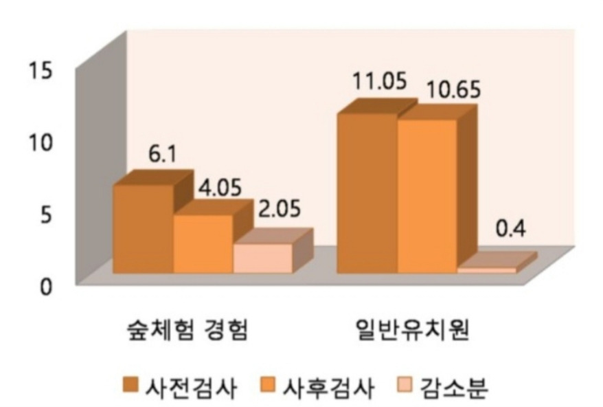왼쪽 위부터 시계방향으로 숲체험 경험 유아의 상처, 좌절, 불안, 일상적 스트레스 감소 반응 연구. <숲체험 활동이 유아의 일상적 스트레스 감소에 미치는 영향. 이인원 2014>
