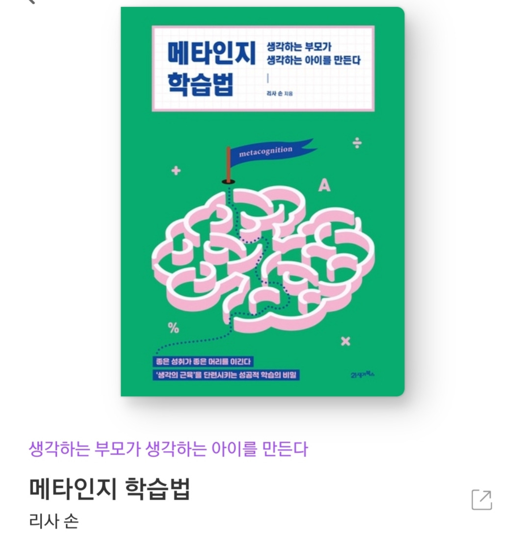 그 당시 메타인지는 사람들에게 생소했다. 용어를 알리기 위해 한참을 설명해야 했다. 더 쉽게 설명해야 하는데, 나도 아는 것에 한계가 있어 어려웠다. 그런데 요즘 리사 손 박사님의 <메타인지 학습법>이라는 책이 이슈 됐다. 그 책은 메타인지를 집중적으로 다뤘다. 아! 이거다. 내가 찾던 모든 답이 거기에 있었다. 쉽게 설명할 방법을 찾았다.