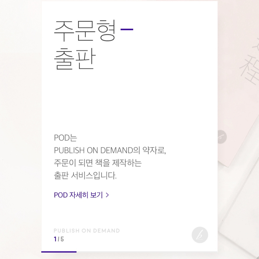 POD는 Publish on Demand의 약자다. 재고를 쌓아두지 않는 주문제작이 가능하다. 출판사를 통한 출판이 어렵다면. 혹은 혼자 한번 해보고 싶다면, POD 서비스를 이용해보자. 북크크나 교보문고의 퍼플이 유명하다. 둘 중에는 북크크가 좀 더 대중적으로 이용되는 듯하다. 파일을 이용해 만들면 각종 서점에 등록되며 주문제작 발송이 가능하다. 표지 디자인은 무료 사진을 쓰기도, 이미지를 구매하기도 한다. 브런치 작가라면 좀 더 쉽게 북크크와 연계되는 서비스를 이용할 수 있다. 이 경우 매거진당 30개의 글이 나오면 책을 만들 수 있다. 브런치 작가라서 좋은 점은 각종 혜택(1~3% 좀 더 높은 인세, 우수 작가 지원 등의 각종 서비스)을 제공받는다는 것이다. 비용은 무료다. 인세는 종이책 35프로, 전자책 70프로라고 한다.