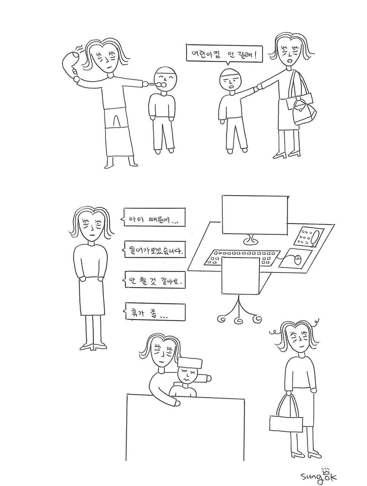 매일 아침 시간에 쫓기며 출근 준비를 하고 아이를 챙겨서 어린이집에 맡기는 것도 나, 다른 직원들과 달리 아이 때문에 시차출퇴근제를 하고, 야근과 회식도 잘할 수 없어 나도 모르게 회사에 눈치가 보이는 것도 나, 밤새 아픈 아이를 간호하느라 잠을 설치는 것도 나, 혹 아이 때문에 휴가를 내야 하는 것도 나, 다 나의 일이었고, 전부 나의 몫이 되어 버렸다.