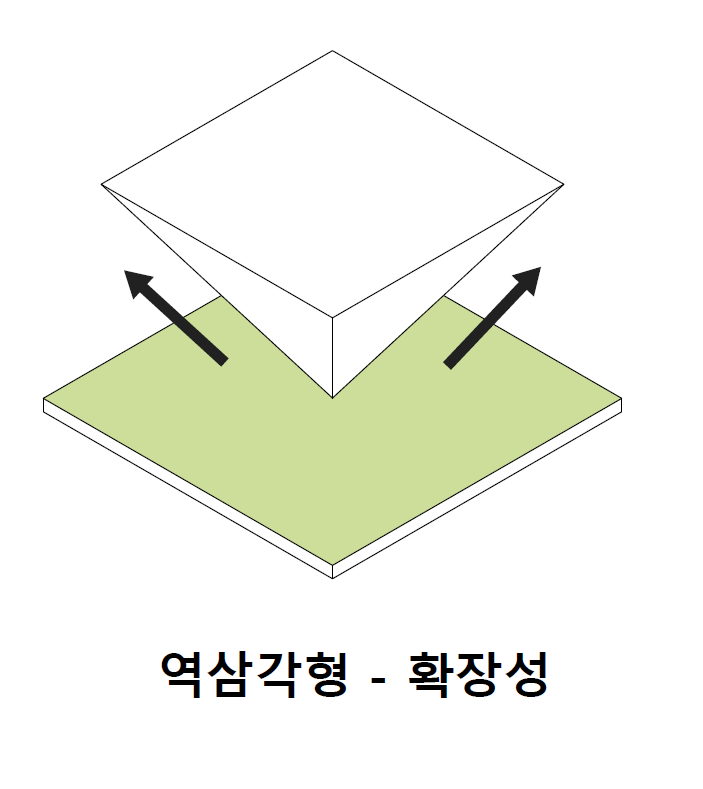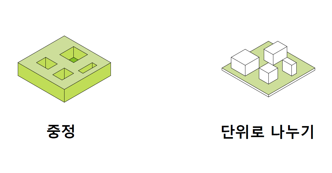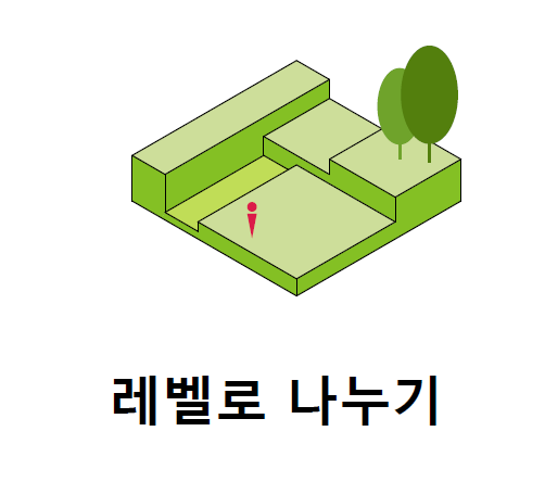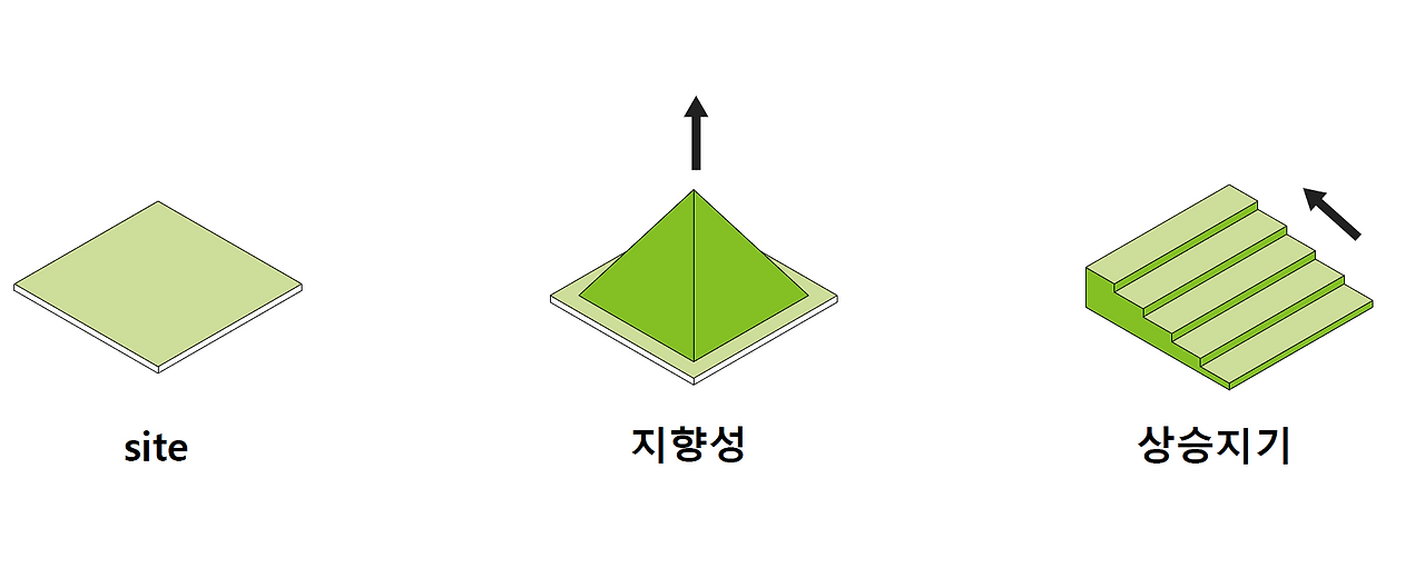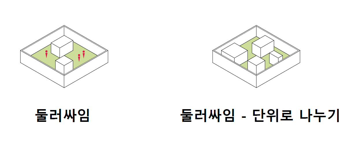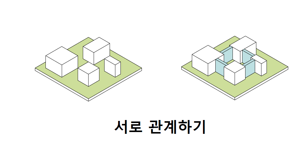 2000년 초반에 우리나라 건축계에서는 랜드스케입(landscape) 건축이라는 용어가 유행했었다. 영국이나 유럽에서 많이 사용되는 개념인데 우리나라로 넘어오면서 마치 새로운 건축개념인양 디자인했었는데 사실 우리나라의 건축 자체가 자연에 순응하는 방법으로 건축을 하였기 때문에 랜드스케입 건축은 우리나라에 잘 맞는 개념이라고 생각된다. 위에 그림에 ‘레벨로 나누기’라는 다이어그램이 랜드스케입이라고 이해하면 된다. 땅을 경계 지을 때 공간화 할 때 단순히 평평한 한 레벨만 생각할 게 아니라 우리나라 같은 지형이 얼마나 높낮이가 다양한지를 보면 토의 공간을 랜드스케입 건축처럼 디자인하면 새로운 개념으로 접근할 수 있을 거라 생각된다.