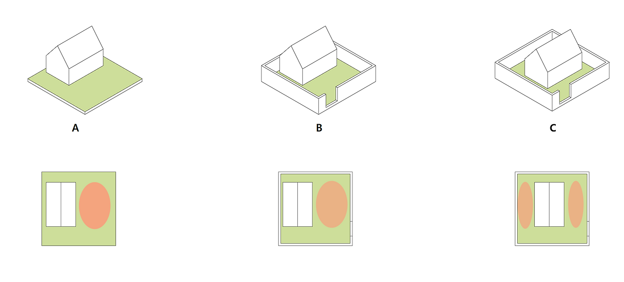 땅이 있고 건물을 배치할 때 벽을 세워서 경계를 만드는데 이 자체가 금의 행위이다. 밑에 그려 놓은 것처럼 건물과 벽을 어떻게 배치하는 것에 따라 토의 공간이 여러 가지로 달라질 수 있다.