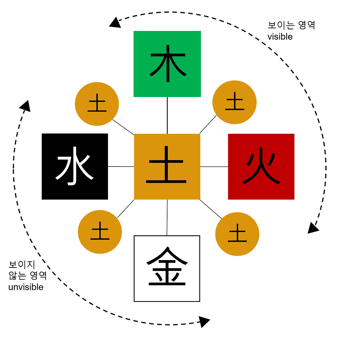 보이는 영역(visible), 보이지 않는 영역(unvisible)이라는 개념은 메를로 퐁티라는 철학가의 책 제목과 유사한데, 그의 현상학적 개념을 설명하면서 오행적 공간을 설명하면 참으로 흥미로운 주제가 될 것 같은데 내용이 너무 철학적으로 어려워질 것 같으니 간단한 개념만 차용해서 설명하는 것으로 하겠다. 단지 보이는 영역인 발산의 공간, 즉 목과 화의 공간은 시작이고 봄과 여름의 공간이니 드러나는 것이 목적이고 자연스럽다. 그리고 토의 공간은 사이 공간이고 절충의 공간이고 발산과 확산공간 사이사이에 매우 중요한 영역이다.