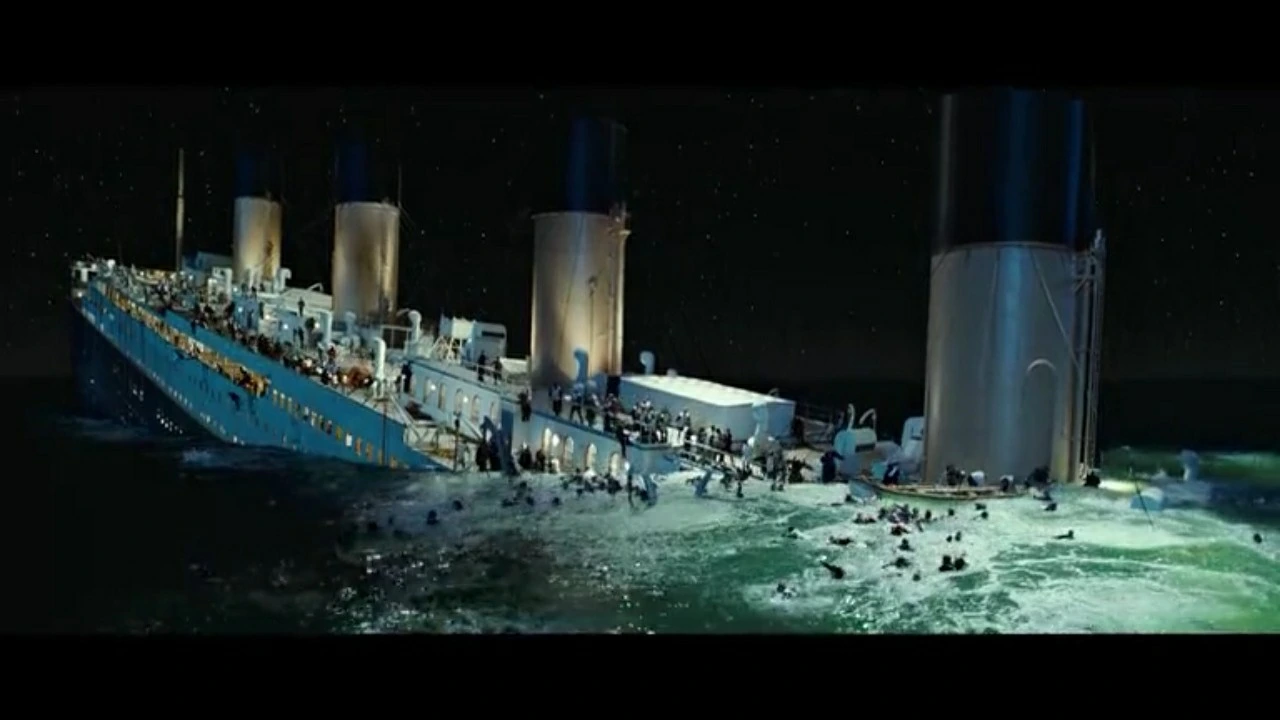 드디어 겨우 남아있던 배의 후미마저 거대한 소용돌이와 함께 심연으로 가라앉고 잭과 로즈는 구사일생으로 나무판 하나에 몸을 의지한다.