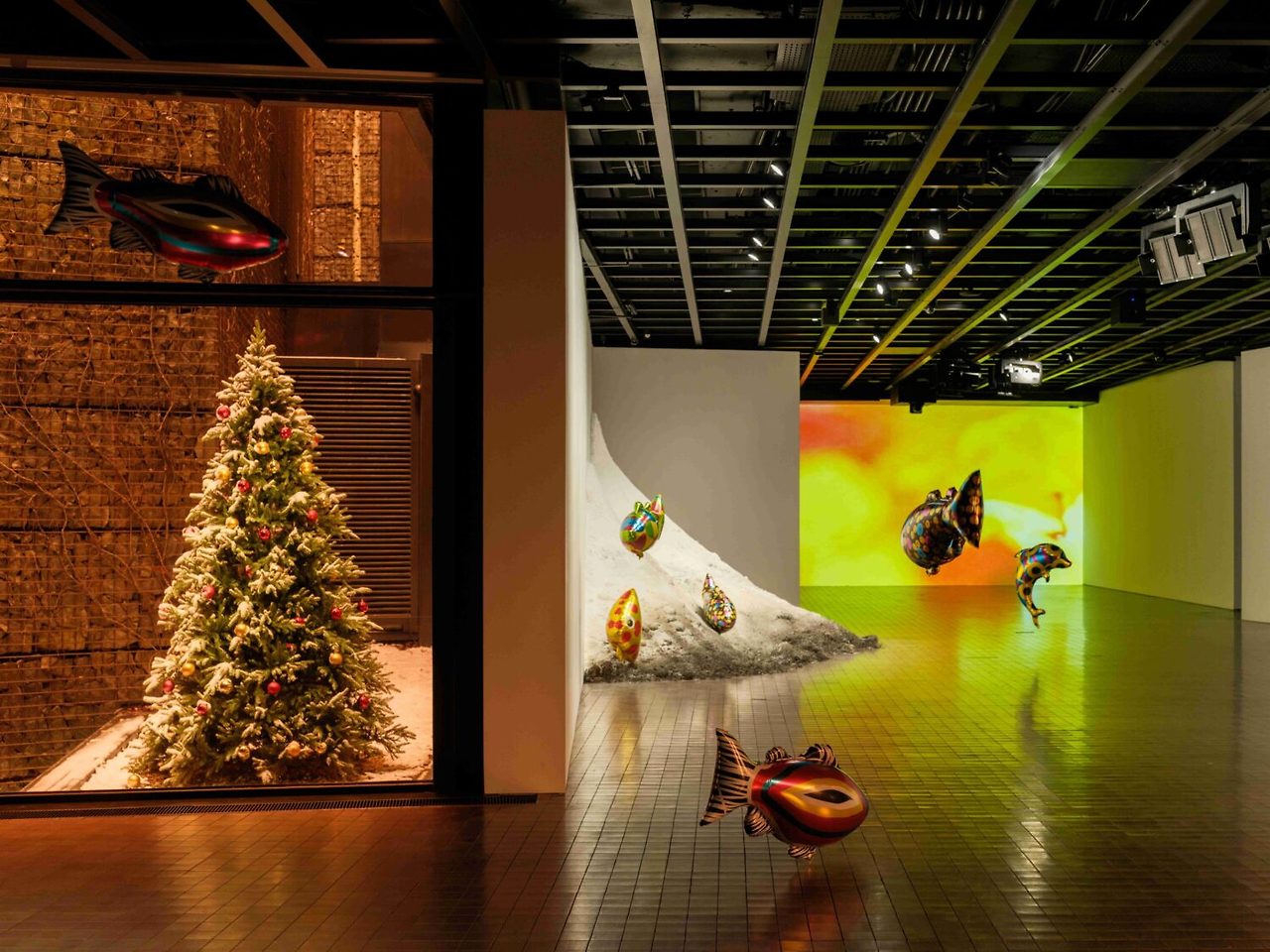 전시장 안에 진열된 눈사람이 녹아내리는 과정에서 일어나는 시각적, 청각적 자극 <Iceman in Reality Park(2022)>, 전시장 공중을 떠다니는 수많은 물고기들이 만들어내는 움직임과 그림자 <My Room is Another Fish Bowl(2018)>, 전시장 한 가운데 1년 내내 존재하지만 12월이 되면 작품보다 크리스마스 트리 그 자체로 인식되는 <Fraught Times: For Eleven Months of the Year it’s an Artwork and in December it’s Christmas (October) (2008)>