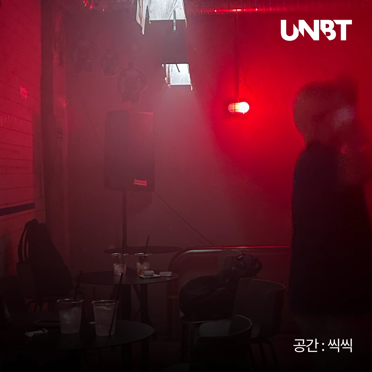 첫 번째 문에 다다랐을 때 보이는 정신없이 붙어 있는 애니메 포스터, 씩씩거리며 붙어 있는 공간 소개지, 의도를 알 수 없는 오브제로 인해 제 예상이 틀렸다는 사실을 깨달았습니다. 그리고 두 번째 문을 열었을 때 노출 콘크리트 인테리어로 된 널따란 공간을 마주했고, 몽환적으로 돌아가는 미러볼 아래 춤추는 사람들이 있었습니다.