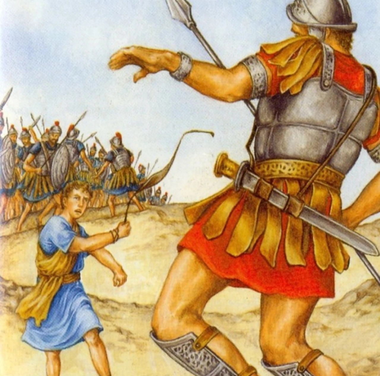 이스라엘이 블레셋과 전쟁을 할 때, 다윗 왕이 그러했다고 한다. 거대한 골리앗 앞에 이스라엘 군이 창도 한 번 못 휘둘러 보고 벌벌 떨고만 있었다.