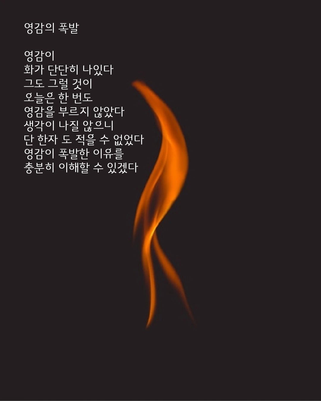 영감은 너무나 많은 것들, 아주 흔한 것 들을 특별하게 만드는 힘이 있다. 영감은 모든 예술의 기초석과 같다. 인류의 과학이 그러했으며 수많은 문학들이 영감에서 비롯되었다. 말하자면 영감은 누구에게나 찾아가지만 그냥 지나치지 않는 사람에게 기회를 준다. 어쩌면 영감이 세상을 특별하게 하는 것이 아니라 그냥 지나치지 않는 아주 평범한 사람이 특별한 세상을 만드는 것 같다.