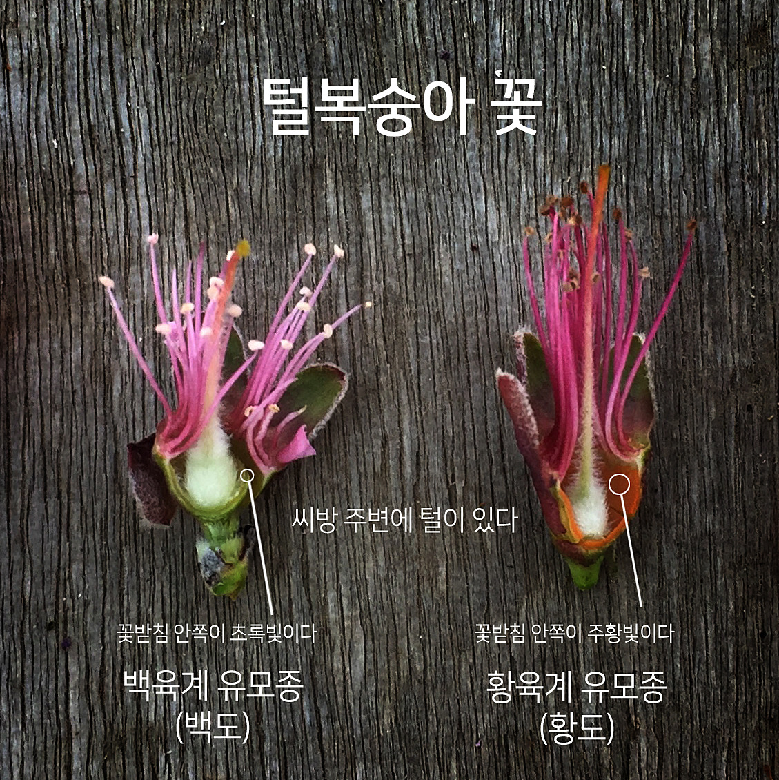 유모종은 씨방에 솜털이 있고 무모종은 씨방 주변이 털 없이 맨질맨질합니다. 그리고 과육이 황색인 황도나 천도복숭아는 꽃받침 내부의 색도 주황빛이 난답니다. 사실 농부님들 중에서도 본인이 처음부터 식재한 밭이 아닐 경우 본인이 농사 짓는 품종이 어떤 품종인지 정확히 모르고 농사를 짓는 경우가 종종 있습니다. 복숭아의 경우 꽃만 봐도 천도복숭아인지 털복숭아인지 백도인지 황도인지 구분이 된다는 사실! 재미있지 않나요?