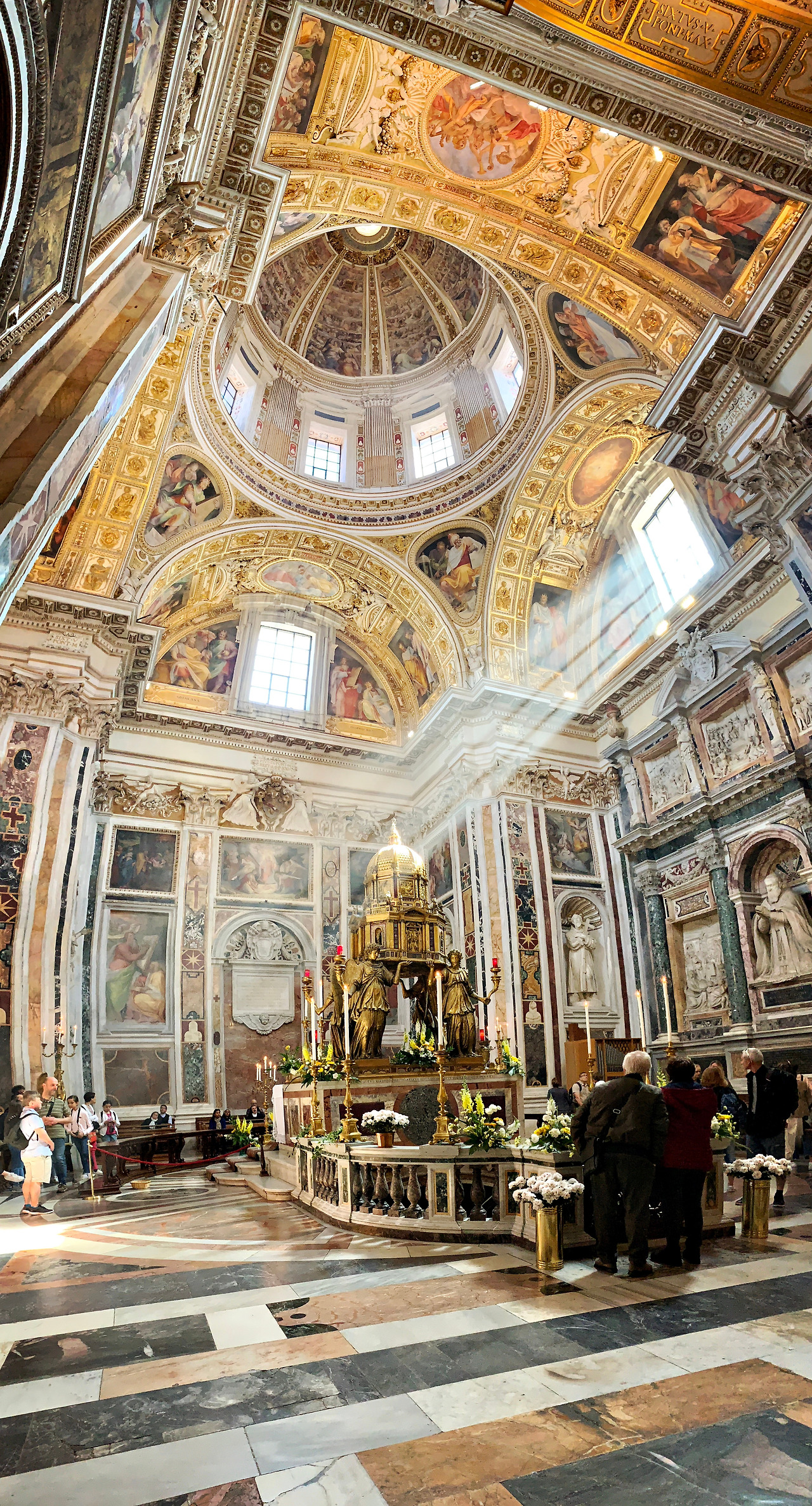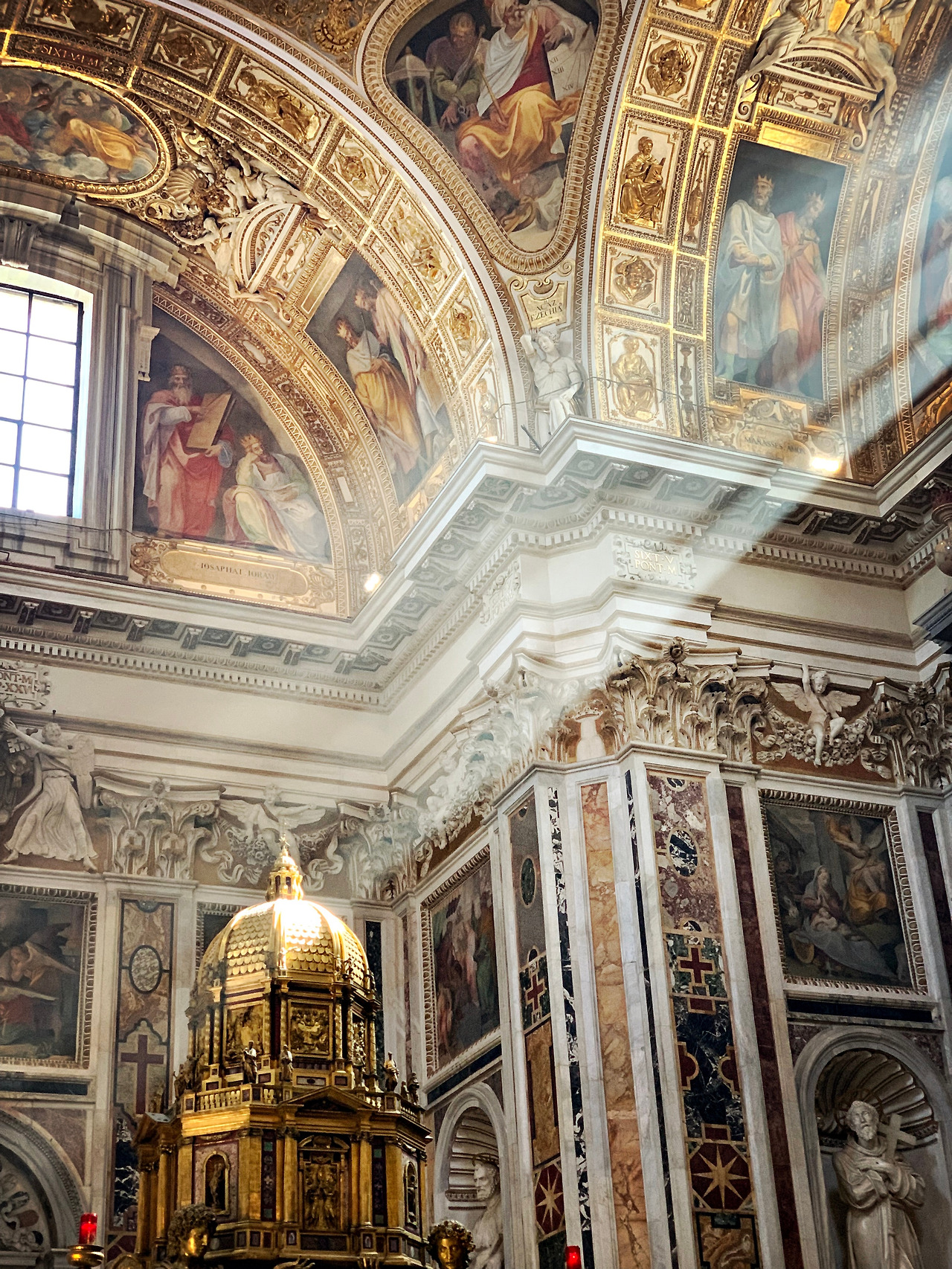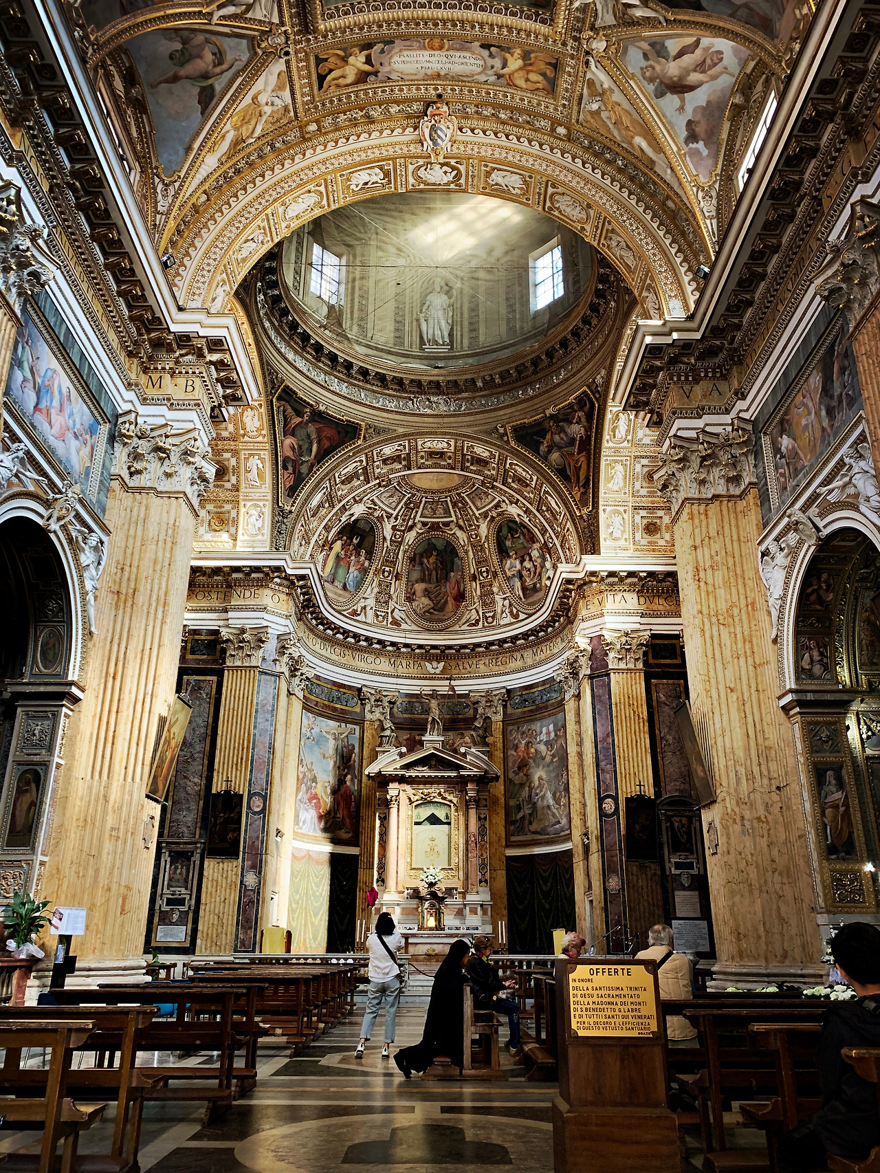 보안검색까지 해야 들어갈 수 있는 성당으로 로마에서도 꽤 큰 성당이다. 천장화를 비롯 온 성당이 금빛 찬란.