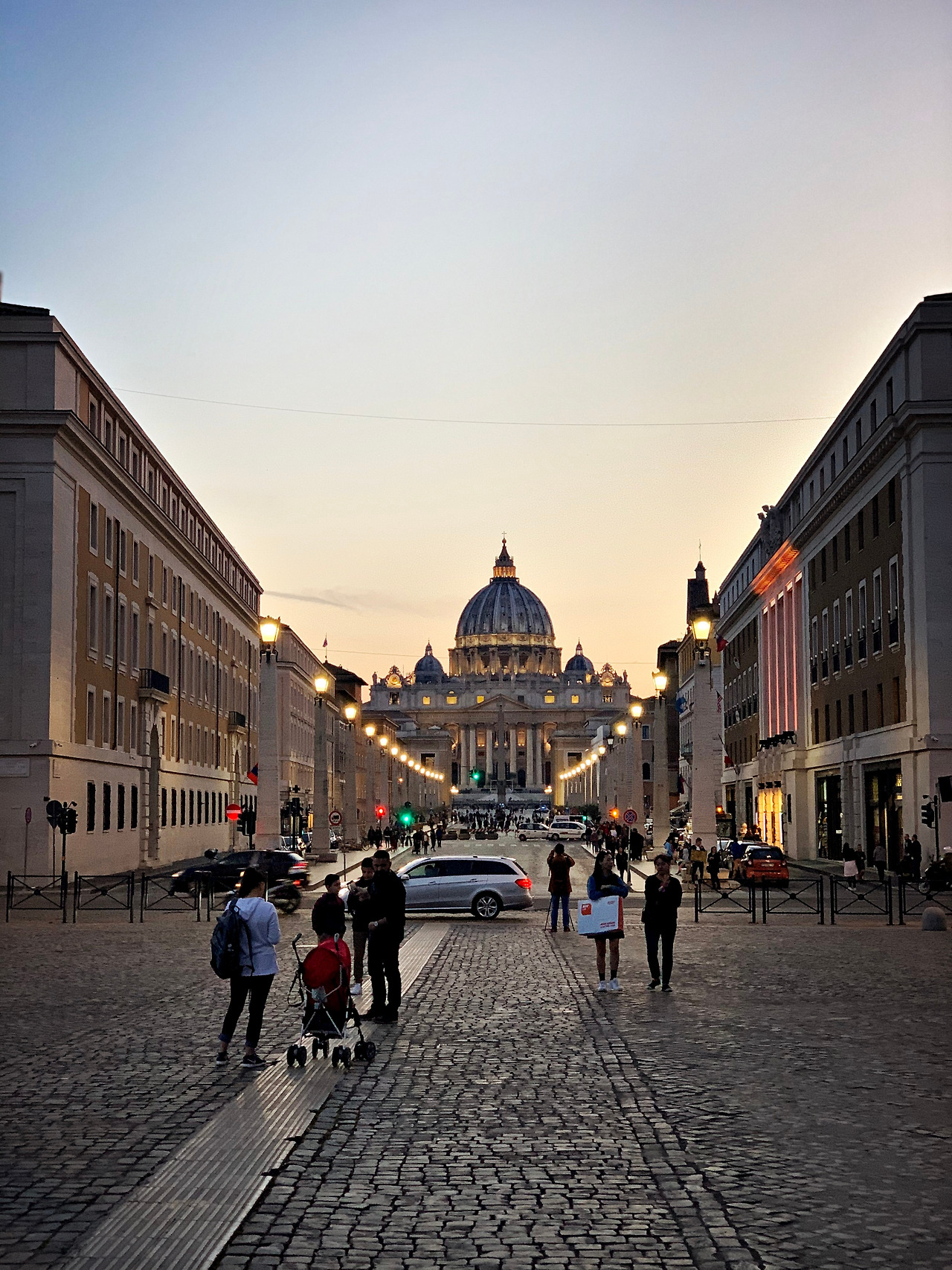 로마의 밤은 낮과는 다른 또 다른 아름다움을 보여줬다. 무엇보다 성 천사성 앞에서 바라보는 해가 지고 조명이 조금씩 켜지는 바티칸 성 베드로 대성당(Basilica di San Pietro)의 모습은 강렬했다. 바티칸 투어 했을 때 몸이 너무 힘들어 제대로 느끼지 못한 성 베드로 대성당의 아름다움을 한 껏 느낄 수 있었다.