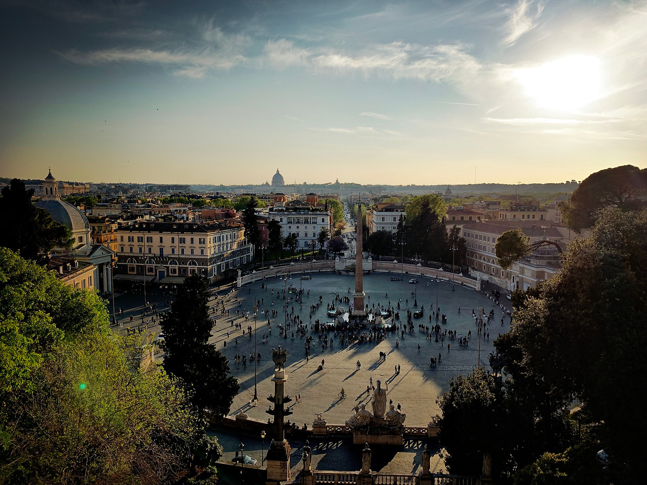저녁 7시경 광장 옆에 자리 잡은 핀초(Pincio) 언덕에서 바라보는 노을의 모습이 예쁘다고 해서 올라가 보았다. 저 멀리 바티칸 성 베드로 대성당의 돔이 보인다. 보통 요즘의 로마는 8시경 해가 지기 시작해서 해가질 때까지 기다렸다가는 시간이 너무 늦어질 것 같아서 해지는 모습은 성 천사성에서 보는 걸로 하고 핀초 언덕을 내려왔다.