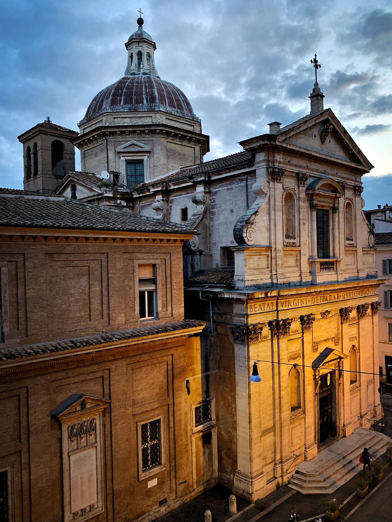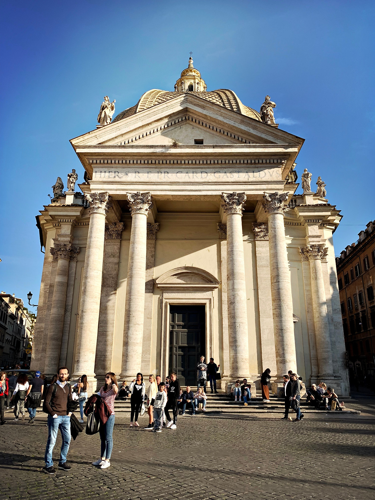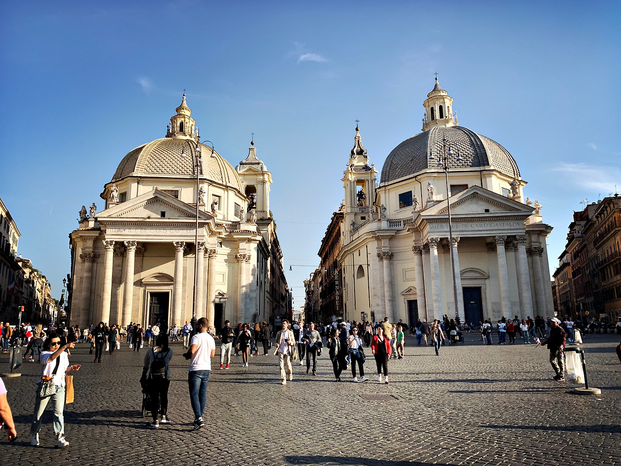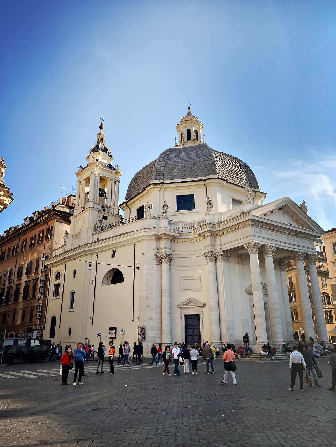 코르소 거리를 사이에 두고 서 있는 2개의 바로크식 교회는 여의도 쌍둥이 빌딩처럼 닮았다. 오른쪽이 산타 마리아 데이 미라콜리 교회(Santa Maria dei Miracoli), 왼쪽이 산타 마리아 데이 몬테산토 교회(Santa Maria dei Montesanto)다. 오른쪽 교회의 본당 큐폴라는 둥근 원, 왼쪽 교회는 타원으로 미묘하게 차이가 난다고 하지만 육안으로는 거의 똑같아 보인다.