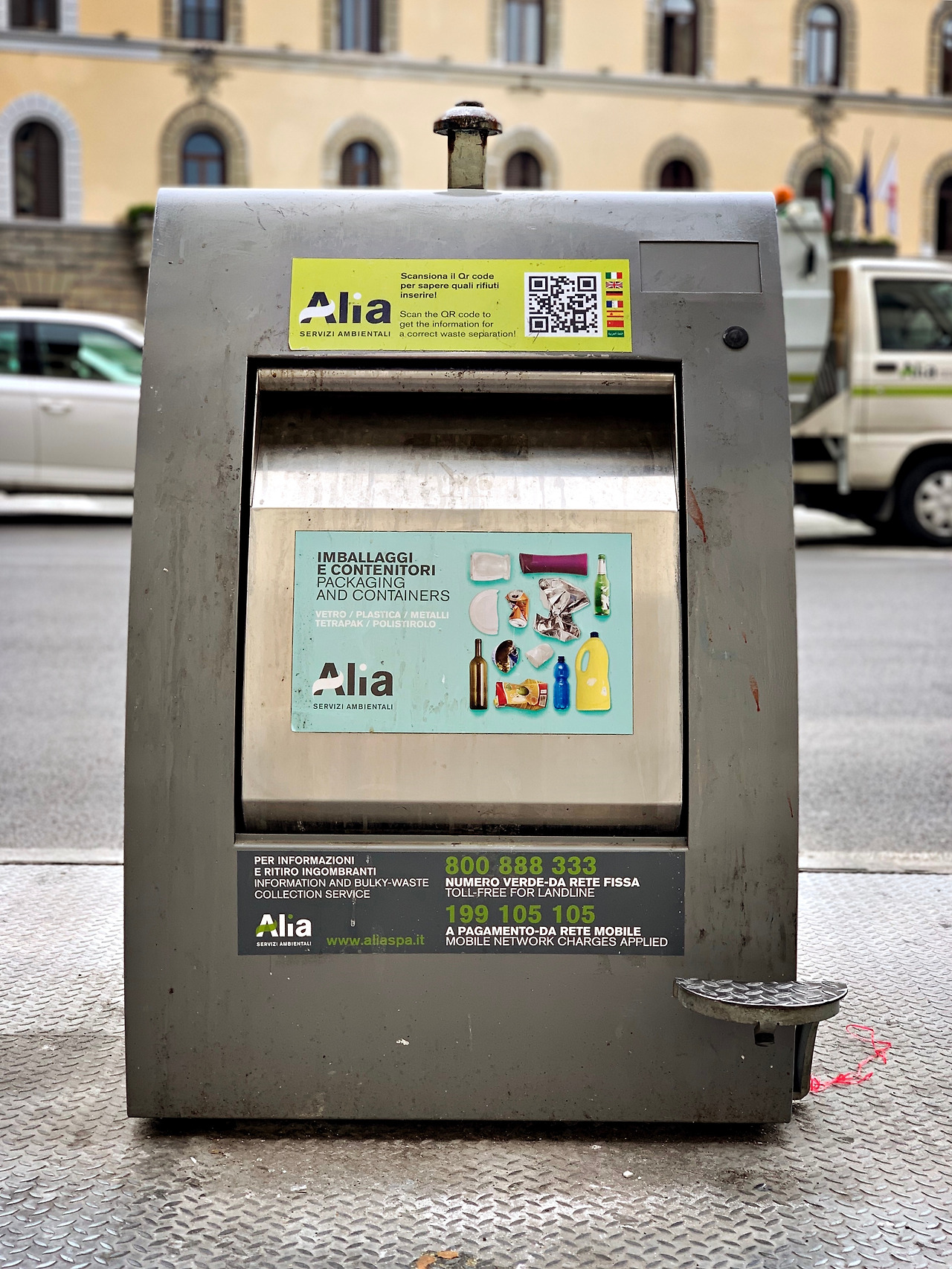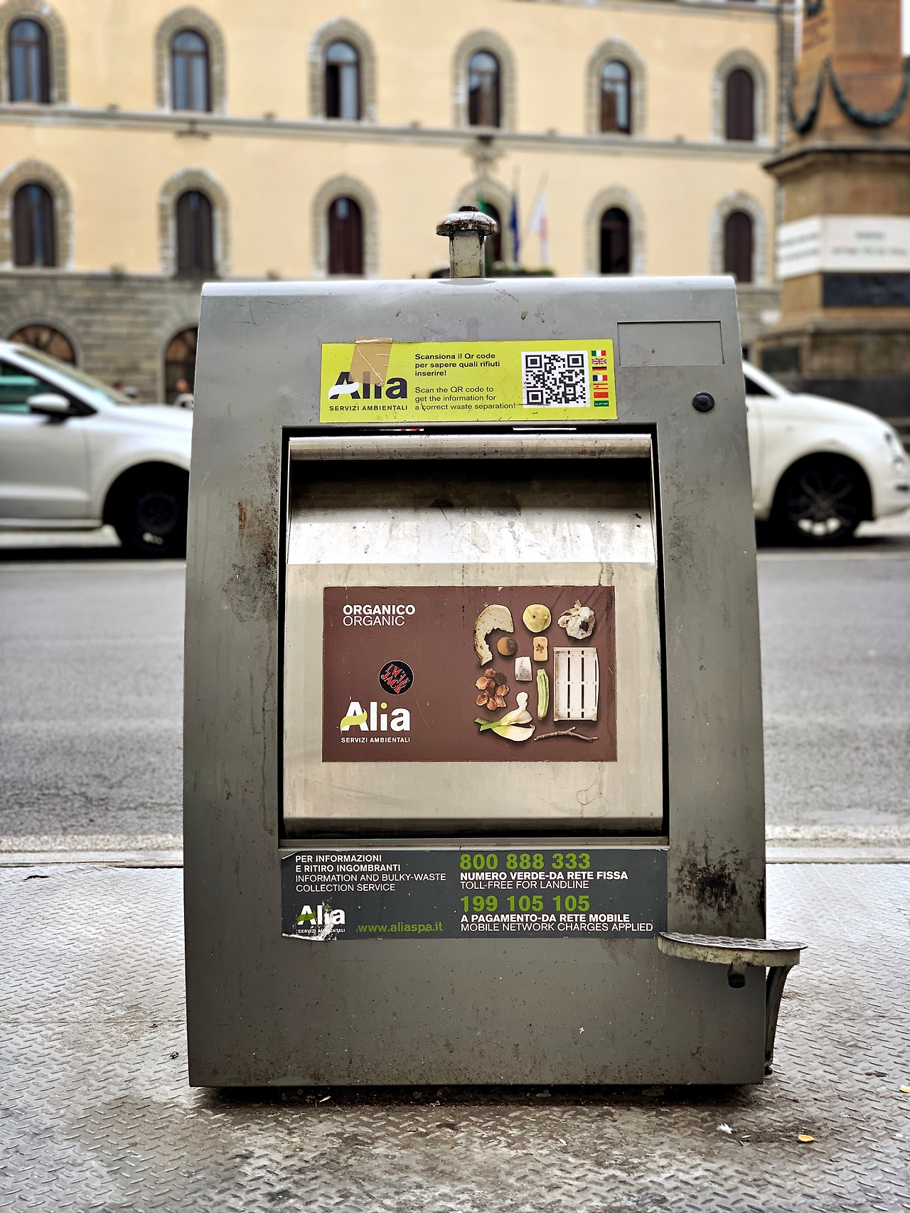 피렌체에서 만난 인상적인 것 중에 하나가 거리의 쓰레기 분리수거 통이다. 새벽마다 두오모로 조깅 나갈 때마다 쓰레기 어떻게 처리하나 관찰했다. Alia라는 업체에서 전담을 하는 것 같은데 새벽에 저 회사의 거대한 쓰레기차가 와서 저 철로 된 쓰레기통을 (쓰레기통 아래에 거대한 쓰레기 매립 통이 있어서) 통째로 번쩍 들어 올려서 쓰레기를 비우고 다시 제자리에 꽂아놓는 방식으로 처리하는 걸 봤다.