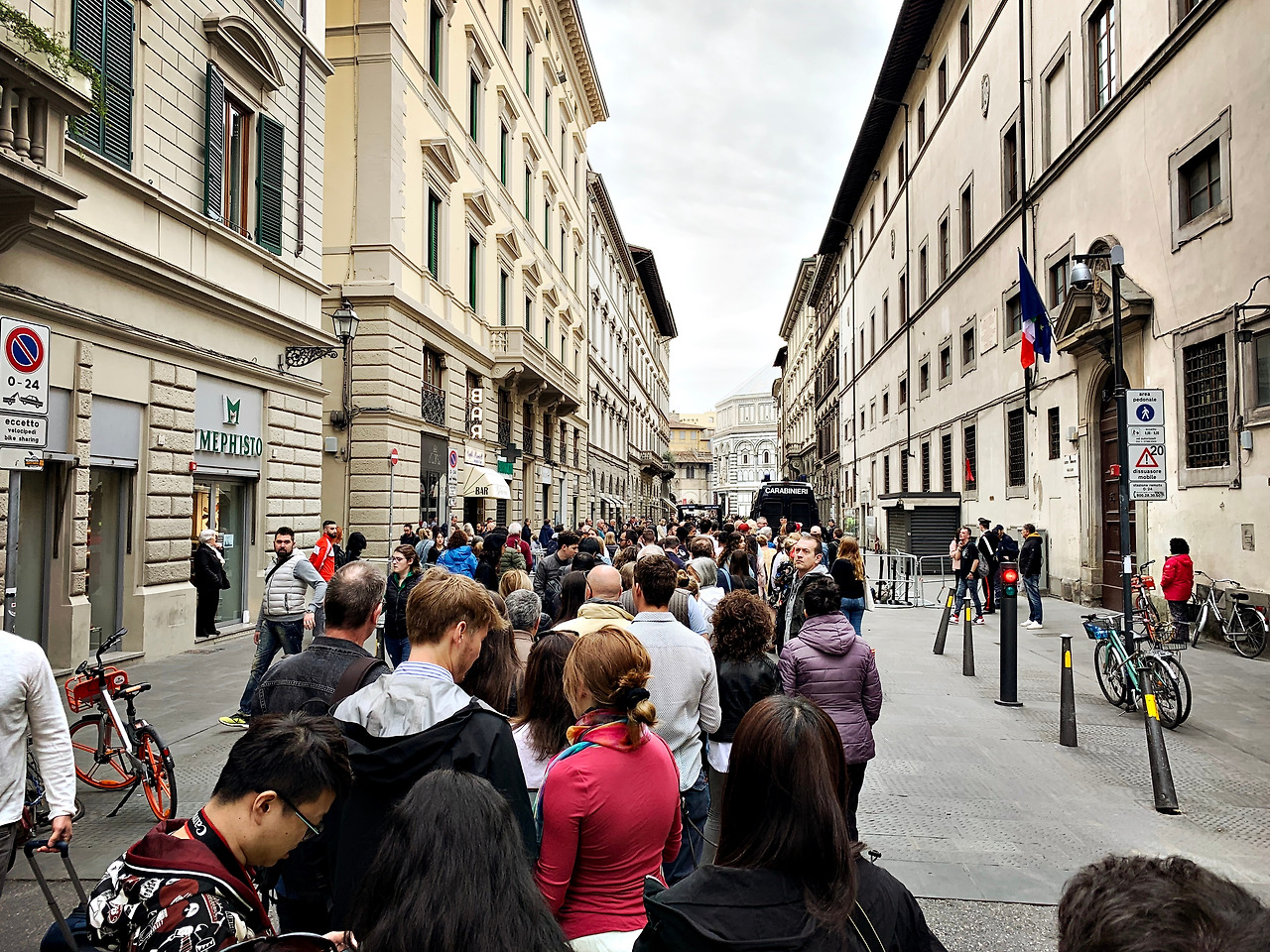 메인광장의 줄을 보니 기다렸다가 가도 먼발치에서나 까치발로 겨우 볼 수 있을 것 같은 생각에 혹시나 하는 마음에 뒤쪽으로 가면 좀 낫지 않을까 하는 생각에 골목을 빙 둘러서 메디체아 라우렌치아나 도서관을 둘러서 가보니 그쪽에서도 줄이 서있었는데 생각보다 줄이 짧았다. 여기까지 왔는데 그냥 돌아갈 수 없어서 줄을 서서 기다렸다. 아침마다 조깅하며 동네 지리를 머릿속에 담아둔 덕을 좀 보았다.